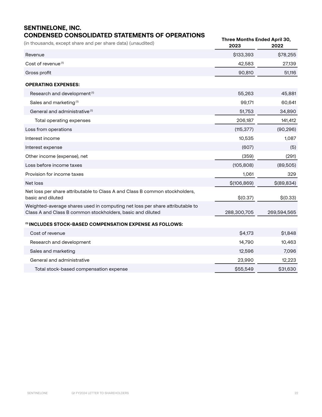 Q1 FY2024 LETTER TO SHAREHOLDERS 22SENTINELONE Three Months Ended April 30, 2023 2022 Revenue $133,393 $78,255 Cost of revenue (1) 42,583 27,139 Gross profit 90,810 51,116 OPERATING EXPENSES: Research and development (1) 55,263 45,881 Sales and marketing (1) 99,171 60,641 General and administrative (1) 51,753 34,890 Total operating expenses 206,187 141,412 Loss from operations (115,377) (90,296) Interest income 10,535 1,087 Interest expense (607) (5) Other income (expense), net (359) (291) Loss before income taxes (105,808) (89,505) Provision for income taxes 1,061 329 Net loss $(106,869) $(89,834) Net loss per share attributable to Class A and Class B common stockholders, basic and diluted $(0.37) $(0.33) Weighted-average shares used in computing net loss per share attributable to Class A and Class B common stockholders, basic and diluted 288,300,705 269,594,565 (1) INCLUDES STOCK-BASED COMPENSATION EXPENSE AS FOLLOWS: Cost of revenue $4,173 $1,848 Research and development 14,790 10,463 Sales and marketing 12,596 7,096 General and administrative 23,990 12,223 Total stock-based compensation expense $55,549 $31,630 SENTINELONE, INC. CONDENSED CONSOLIDATED STATEMENTS OF OPERATIONS (in thousands, except share and per share data) (unaudited)