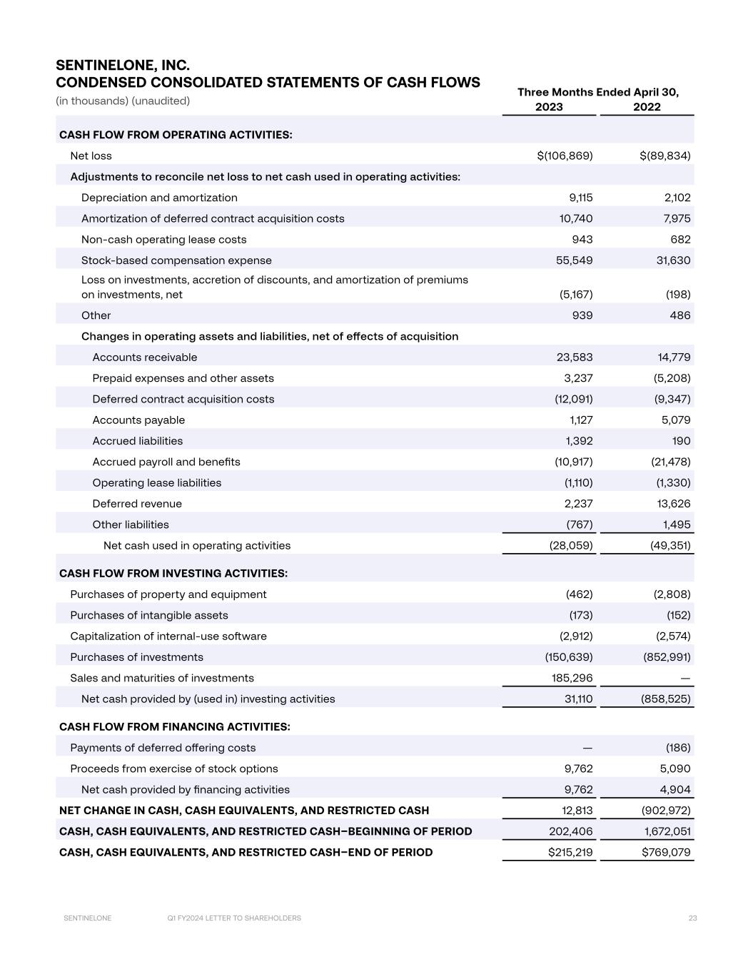 Q1 FY2024 LETTER TO SHAREHOLDERS 23SENTINELONE Three Months Ended April 30, 2023 2022 CASH FLOW FROM OPERATING ACTIVITIES: Net loss $(106,869) $(89,834) Adjustments to reconcile net loss to net cash used in operating activities: Depreciation and amortization 9,115 2,102 Amortization of deferred contract acquisition costs 10,740 7,975 Non-cash operating lease costs 943 682 Stock-based compensation expense 55,549 31,630 Loss on investments, accretion of discounts, and amortization of premiums on investments, net (5,167) (198) Other 939 486 Changes in operating assets and liabilities, net of effects of acquisition Accounts receivable 23,583 14,779 Prepaid expenses and other assets 3,237 (5,208) Deferred contract acquisition costs (12,091) (9,347) Accounts payable 1,127 5,079 Accrued liabilities 1,392 190 Accrued payroll and benefits (10,917) (21,478) Operating lease liabilities (1,110) (1,330) Deferred revenue 2,237 13,626 Other liabilities (767) 1,495 Net cash used in operating activities (28,059) (49,351) CASH FLOW FROM INVESTING ACTIVITIES: Purchases of property and equipment (462) (2,808) Purchases of intangible assets (173) (152) Capitalization of internal-use software (2,912) (2,574) Purchases of investments (150,639) (852,991) Sales and maturities of investments 185,296 — Net cash provided by (used in) investing activities 31,110 (858,525) CASH FLOW FROM FINANCING ACTIVITIES: Payments of deferred offering costs — (186) Proceeds from exercise of stock options 9,762 5,090 Net cash provided by financing activities 9,762 4,904 NET CHANGE IN CASH, CASH EQUIVALENTS, AND RESTRICTED CASH 12,813 (902,972) CASH, CASH EQUIVALENTS, AND RESTRICTED CASH–BEGINNING OF PERIOD 202,406 1,672,051 CASH, CASH EQUIVALENTS, AND RESTRICTED CASH–END OF PERIOD $215,219 $769,079 SENTINELONE, INC. CONDENSED CONSOLIDATED STATEMENTS OF CASH FLOWS (in thousands) (unaudited)