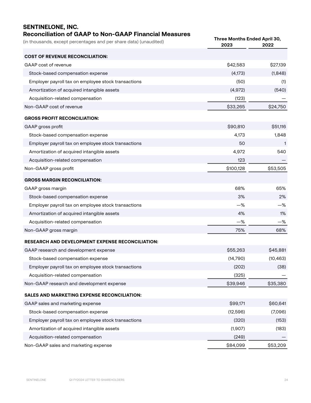 Q1 FY2024 LETTER TO SHAREHOLDERS 24SENTINELONE Three Months Ended April 30, 2023 2022 COST OF REVENUE RECONCILIATION: GAAP cost of revenue $42,583 $27,139 Stock-based compensation expense (4,173) (1,848) Employer payroll tax on employee stock transactions (50) (1) Amortization of acquired intangible assets (4,972) (540) Acquisition-related compensation (123) — Non-GAAP cost of revenue $33,265 $24,750 GROSS PROFIT RECONCILIATION: GAAP gross profit $90,810 $51,116 Stock-based compensation expense 4,173 1,848 Employer payroll tax on employee stock transactions 50 1 Amortization of acquired intangible assets 4,972 540 Acquisition-related compensation 123 — Non-GAAP gross profit $100,128 $53,505 GROSS MARGIN RECONCILIATION: GAAP gross margin 68% 65% Stock-based compensation expense 3% 2% Employer payroll tax on employee stock transactions —% —% Amortization of acquired intangible assets 4% 1% Acquisition-related compensation —% —% Non-GAAP gross margin 75% 68% RESEARCH AND DEVELOPMENT EXPENSE RECONCILIATION: GAAP research and development expense $55,263 $45,881 Stock-based compensation expense (14,790) (10,463) Employer payroll tax on employee stock transactions (202) (38) Acquisition-related compensation (325) — Non-GAAP research and development expense $39,946 $35,380 SALES AND MARKETING EXPENSE RECONCILIATION: GAAP sales and marketing expense $99,171 $60,641 Stock-based compensation expense (12,596) (7,096) Employer payroll tax on employee stock transactions (320) (153) Amortization of acquired intangible assets (1,907) (183) Acquisition-related compensation (249) — Non-GAAP sales and marketing expense $84,099 $53,209 SENTINELONE, INC. Reconciliation of GAAP to Non-GAAP Financial Measures (in thousands, except percentages and per share data) (unaudited)
