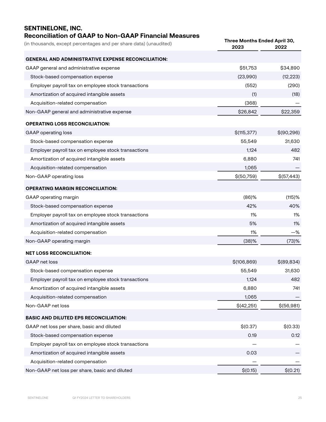 Q1 FY2024 LETTER TO SHAREHOLDERS 25SENTINELONE Three Months Ended April 30, 2023 2022 GENERAL AND ADMINISTRATIVE EXPENSE RECONCILIATION: GAAP general and administrative expense $51,753 $34,890 Stock-based compensation expense (23,990) (12,223) Employer payroll tax on employee stock transactions (552) (290) Amortization of acquired intangible assets (1) (18) Acquisition-related compensation (368) — Non-GAAP general and administrative expense $26,842 $22,359 OPERATING LOSS RECONCILIATION: GAAP operating loss $(115,377) $(90,296) Stock-based compensation expense 55,549 31,630 Employer payroll tax on employee stock transactions 1,124 482 Amortization of acquired intangible assets 6,880 741 Acquisition-related compensation 1,065 — Non-GAAP operating loss $(50,759) $(57,443) OPERATING MARGIN RECONCILIATION: GAAP operating margin (86)% (115)% Stock-based compensation expense 42% 40% Employer payroll tax on employee stock transactions 1% 1% Amortization of acquired intangible assets 5% 1% Acquisition-related compensation 1% —% Non-GAAP operating margin (38)% (73)% NET LOSS RECONCILIATION: GAAP net loss $(106,869) $(89,834) Stock-based compensation expense 55,549 31,630 Employer payroll tax on employee stock transactions 1,124 482 Amortization of acquired intangible assets 6,880 741 Acquisition-related compensation 1,065 — Non-GAAP net loss $(42,251) $(56,981) BASIC AND DILUTED EPS RECONCILIATION: GAAP net loss per share, basic and diluted $(0.37) $(0.33) Stock-based compensation expense 0.19 0.12 Employer payroll tax on employee stock transactions — — Amortization of acquired intangible assets 0.03 — Acquisition-related compensation — — Non-GAAP net loss per share, basic and diluted $(0.15) $(0.21) SENTINELONE, INC. Reconciliation of GAAP to Non-GAAP Financial Measures (in thousands, except percentages and per share data) (unaudited)