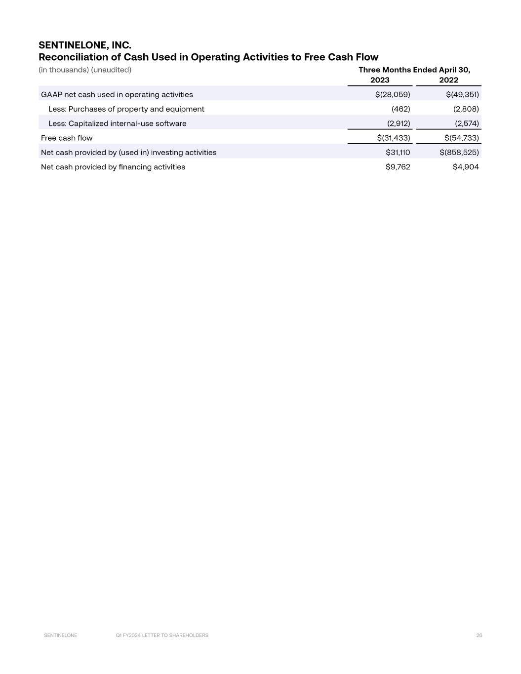 Q1 FY2024 LETTER TO SHAREHOLDERS 26SENTINELONE Three Months Ended April 30, 2023 2022 GAAP net cash used in operating activities $(28,059) $(49,351) Less: Purchases of property and equipment (462) (2,808) Less: Capitalized internal-use software (2,912) (2,574) Free cash flow $(31,433) $(54,733) Net cash provided by (used in) investing activities $31,110 $(858,525) Net cash provided by financing activities $9,762 $4,904 SENTINELONE, INC. Reconciliation of Cash Used in Operating Activities to Free Cash Flow (in thousands) (unaudited)
