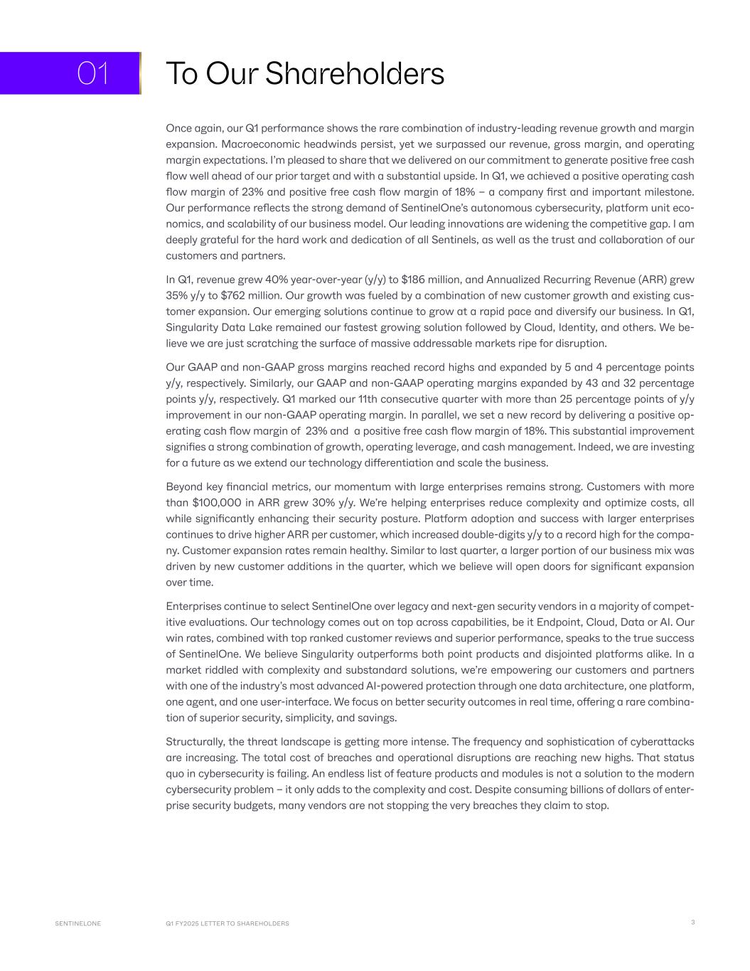 Q1 FY2025 Letter to SharehoLderSSENTINELONE 3 01 To Our Shareholders Once again, our Q1 performance shows the rare combination of industry-leading revenue growth and margin expansion. Macroeconomic headwinds persist, yet we surpassed our revenue, gross margin, and operating margin expectations. I’m pleased to share that we delivered on our commitment to generate positive free cash flow well ahead of our prior target and with a substantial upside. In Q1, we achieved a positive operating cash flow margin of 23% and positive free cash flow margin of 18% – a company first and important milestone. Our performance reflects the strong demand of SentinelOne’s autonomous cybersecurity, platform unit eco- nomics, and scalability of our business model. Our leading innovations are widening the competitive gap. I am deeply grateful for the hard work and dedication of all Sentinels, as well as the trust and collaboration of our customers and partners. In Q1, revenue grew 40% year-over-year (y/y) to $186 million, and Annualized Recurring Revenue (ARR) grew 35% y/y to $762 million. Our growth was fueled by a combination of new customer growth and existing cus- tomer expansion. Our emerging solutions continue to grow at a rapid pace and diversify our business. In Q1, Singularity Data Lake remained our fastest growing solution followed by Cloud, Identity, and others. We be- lieve we are just scratching the surface of massive addressable markets ripe for disruption. Our GAAP and non-GAAP gross margins reached record highs and expanded by 5 and 4 percentage points y/y, respectively. Similarly, our GAAP and non-GAAP operating margins expanded by 43 and 32 percentage points y/y, respectively. Q1 marked our 11th consecutive quarter with more than 25 percentage points of y/y improvement in our non-GAAP operating margin. In parallel, we set a new record by delivering a positive op- erating cash flow margin of 23% and a positive free cash flow margin of 18%. This substantial improvement signifies a strong combination of growth, operating leverage, and cash management. Indeed, we are investing for a future as we extend our technology differentiation and scale the business. Beyond key financial metrics, our momentum with large enterprises remains strong. Customers with more than $100,000 in ARR grew 30% y/y. We’re helping enterprises reduce complexity and optimize costs, all while significantly enhancing their security posture. Platform adoption and success with larger enterprises continues to drive higher ARR per customer, which increased double-digits y/y to a record high for the compa- ny. Customer expansion rates remain healthy. Similar to last quarter, a larger portion of our business mix was driven by new customer additions in the quarter, which we believe will open doors for significant expansion over time. Enterprises continue to select SentinelOne over legacy and next-gen security vendors in a majority of compet- itive evaluations. Our technology comes out on top across capabilities, be it Endpoint, Cloud, Data or AI. Our win rates, combined with top ranked customer reviews and superior performance, speaks to the true success of SentinelOne. We believe Singularity outperforms both point products and disjointed platforms alike. In a market riddled with complexity and substandard solutions, we’re empowering our customers and partners with one of the industry’s most advanced AI-powered protection through one data architecture, one platform, one agent, and one user-interface. We focus on better security outcomes in real time, offering a rare combina- tion of superior security, simplicity, and savings. Structurally, the threat landscape is getting more intense. The frequency and sophistication of cyberattacks are increasing. The total cost of breaches and operational disruptions are reaching new highs. That status quo in cybersecurity is failing. An endless list of feature products and modules is not a solution to the modern cybersecurity problem – it only adds to the complexity and cost. Despite consuming billions of dollars of enter- prise security budgets, many vendors are not stopping the very breaches they claim to stop.