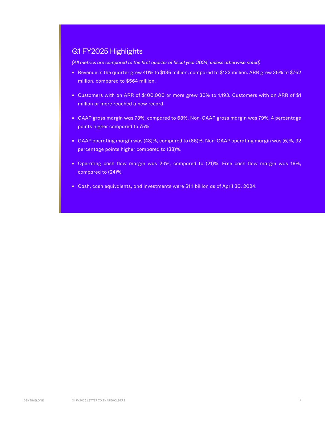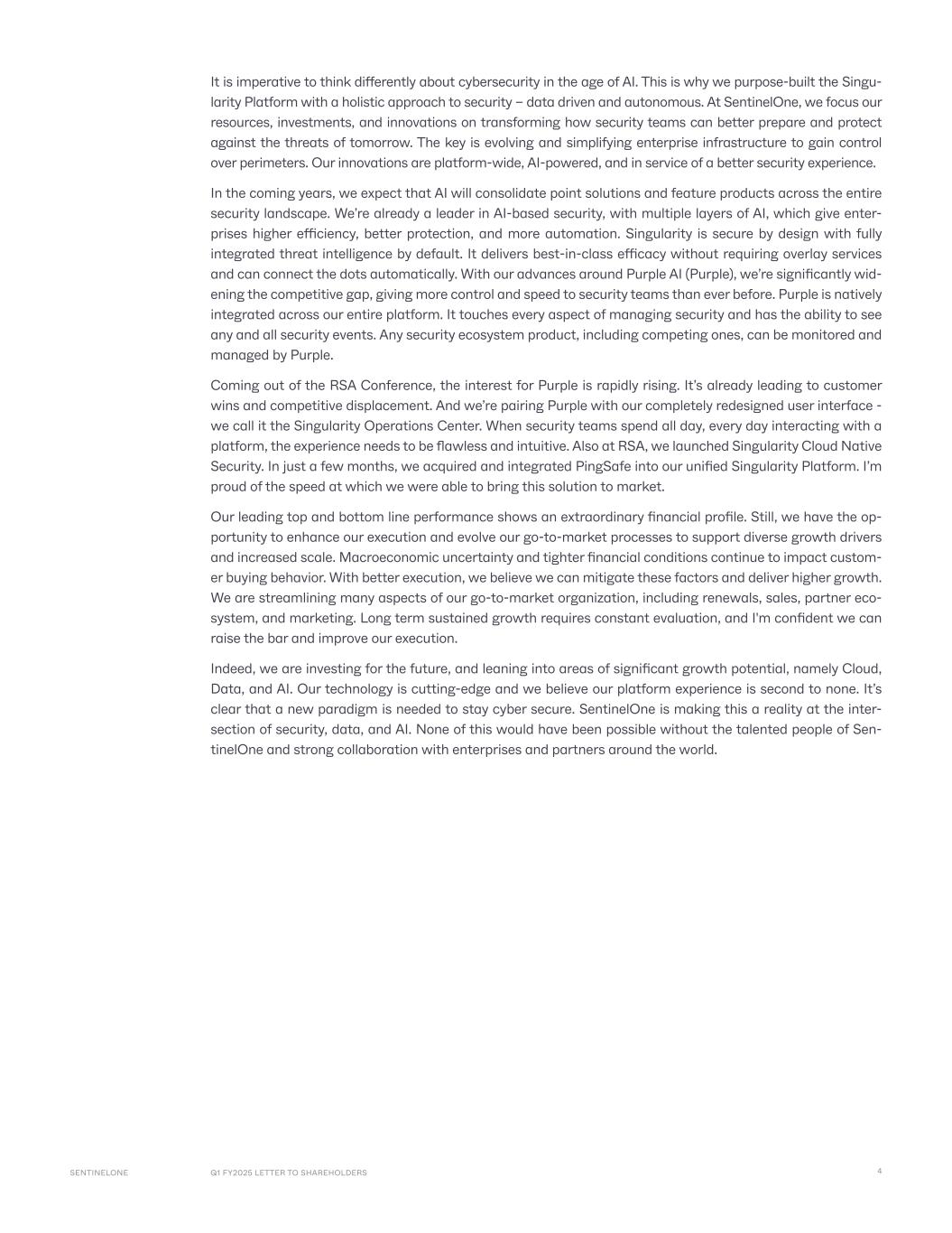 Q1 FY2025 Letter to SharehoLderSSENTINELONE 4 It is imperative to think differently about cybersecurity in the age of AI. This is why we purpose-built the Singu- larity Platform with a holistic approach to security – data driven and autonomous. At SentinelOne, we focus our resources, investments, and innovations on transforming how security teams can better prepare and protect against the threats of tomorrow. The key is evolving and simplifying enterprise infrastructure to gain control over perimeters. Our innovations are platform-wide, AI-powered, and in service of a better security experience. In the coming years, we expect that AI will consolidate point solutions and feature products across the entire security landscape. We’re already a leader in AI-based security, with multiple layers of AI, which give enter- prises higher efficiency, better protection, and more automation. Singularity is secure by design with fully integrated threat intelligence by default. It delivers best-in-class efficacy without requiring overlay services and can connect the dots automatically. With our advances around Purple AI (Purple), we’re significantly wid- ening the competitive gap, giving more control and speed to security teams than ever before. Purple is natively integrated across our entire platform. It touches every aspect of managing security and has the ability to see any and all security events. Any security ecosystem product, including competing ones, can be monitored and managed by Purple. Coming out of the RSA Conference, the interest for Purple is rapidly rising. It’s already leading to customer wins and competitive displacement. And we’re pairing Purple with our completely redesigned user interface - we call it the Singularity Operations Center. When security teams spend all day, every day interacting with a platform, the experience needs to be flawless and intuitive. Also at RSA, we launched Singularity Cloud Native Security. In just a few months, we acquired and integrated PingSafe into our unified Singularity Platform. I’m proud of the speed at which we were able to bring this solution to market. Our leading top and bottom line performance shows an extraordinary financial profile. Still, we have the op- portunity to enhance our execution and evolve our go-to-market processes to support diverse growth drivers and increased scale. Macroeconomic uncertainty and tighter financial conditions continue to impact custom- er buying behavior. With better execution, we believe we can mitigate these factors and deliver higher growth. We are streamlining many aspects of our go-to-market organization, including renewals, sales, partner eco- system, and marketing. Long term sustained growth requires constant evaluation, and I'm confident we can raise the bar and improve our execution. Indeed, we are investing for the future, and leaning into areas of significant growth potential, namely Cloud, Data, and AI. Our technology is cutting-edge and we believe our platform experience is second to none. It’s clear that a new paradigm is needed to stay cyber secure. SentinelOne is making this a reality at the inter- section of security, data, and AI. None of this would have been possible without the talented people of Sen- tinelOne and strong collaboration with enterprises and partners around the world.