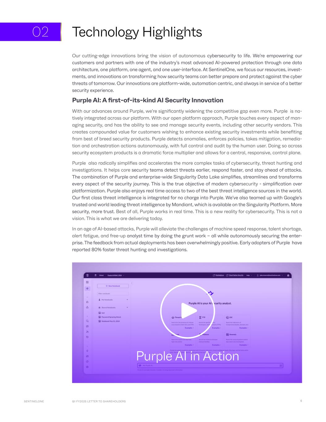 Q1 FY2025 Letter to SharehoLderSSENTINELONE 6 02 Technology Highlights Our cutting-edge innovations bring the vision of autonomous cybersecurity to life. We’re empowering our customers and partners with one of the industry’s most advanced AI-powered protection through one data architecture, one platform, one agent, and one user-interface. At SentinelOne, we focus our resources, invest- ments, and innovations on transforming how security teams can better prepare and protect against the cyber threats of tomorrow. Our innovations are platform-wide, automation centric, and always in service of a better security experience. Purple AI: A first-of-its-kind AI Security Innovation With our advances around Purple, we’re significantly widening the competitive gap even more. Purple is na- tively integrated across our platform. With our open platform approach, Purple touches every aspect of man- aging security, and has the ability to see and manage security events, including other security vendors. This creates compounded value for customers wishing to enhance existing security investments while benefiting from best of breed security products. Purple detects anomalies, enforces policies, takes mitigation, remedia- tion and orchestration actions autonomously, with full control and audit by the human user. Doing so across security ecosystem products is a dramatic force multiplier and allows for a central, responsive, control plane. Purple also radically simplifies and accelerates the more complex tasks of cybersecurity, threat hunting and investigations. It helps core security teams detect threats earlier, respond faster, and stay ahead of attacks. The combination of Purple and enterprise-wide Singularity Data Lake simplifies, streamlines and transforms every aspect of the security journey. This is the true objective of modern cybersecurity - simplification over platformization. Purple also enjoys real time access to two of the best threat intelligence sources in the world. Our first class threat intelligence is integrated for no charge into Purple. We’ve also teamed up with Google’s trusted and world leading threat intelligence by Mandiant, which is available on the Singularity Platform. More security, more trust. Best of all, Purple works in real time. This is a new reality for cybersecurity. This is not a vision. This is what we are delivering today. In an age of AI-based attacks, Purple will alleviate the challenges of machine speed response, talent shortage, alert fatigue, and free-up analyst time by doing the grunt work – all while autonomously securing the enter- prise. The feedback from actual deployments has been overwhelmingly positive. Early adopters of Purple have reported 80% faster threat hunting and investigations.