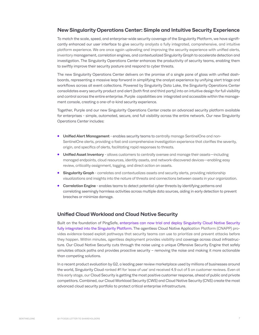 Q1 FY2025 Letter to SharehoLderSSENTINELONE 7 New Singularity Operations Center: Simple and Intuitive Security Experience To match the scale, speed, and enterprise-wide security coverage of the Singularity Platform, we have signifi- cantly enhanced our user interface to give security analysts a fully integrated, comprehensive, and intuitive platform experience. We are once again upleveling and improving the security experience with unified alerts, inventory management, correlation engines, and contextualized Singularity Graph to accelerate detection and investigation. The Singularity Operations Center enhances the productivity of security teams, enabling them to swiftly improve their security posture and respond to cyber threats. The new Singularity Operations Center delivers on the promise of a single pane of glass with unified dash- boards, representing a massive leap forward in simplifying the analyst experience by unifying alert triage and workflows across all event collections. Powered by Singularity Data Lake, the Singularity Operations Center consolidates every security product and alert (both first and third party) into an intuitive design for full visibility and control across the entire enterprise. Purple capabilities are integrated and accessible within the manage- ment console, creating a one-of-a-kind security experience. Together, Purple and our new Singularity Operations Center create an advanced security platform available for enterprises - simple, automated, secure, and full visibility across the entire network. Our new Singularity Operations Center includes: • Unified Alert Management - enables security teams to centrally manage SentinelOne and non- SentinelOne alerts, providing a fast and comprehensive investigation experience that clarifies the severity, origin, and specifics of alerts, facilitating rapid responses to threats. • Unified Asset Inventory - allows customers to centrally oversee and manage their assets—including managed endpoints, cloud resources, identity assets, and network-discovered devices—enabling easy review, criticality assignment, tagging, and direct action on assets. • Singularity Graph - correlates and contextualizes assets and security alerts, providing relationship visualizations and insights into the nature of threats and connections between assets in your organization. • Correlation Engine - enables teams to detect potential cyber threats by identifying patterns and correlating seemingly harmless activities across multiple data sources, aiding in early detection to prevent breaches or minimize damage. Unified Cloud Workload and Cloud Native Security Built on the foundation of PingSafe, enterprises can now trial and deploy Singularity Cloud Native Security fully integrated into the Singularity Platform. The agentless Cloud Native Application Platform (CNAPP) pro- vides evidence-based exploit pathways that security teams can use to prioritize and prevent attacks before they happen. Within minutes, agentless deployment provides visibility and coverage across cloud infrastruc- ture. Our Cloud Native Security cuts through the noise using a unique Offensive Security Engine that safely simulates attack paths and provides proactive security – removing the noise and making it more actionable than competing solutions. In a recent product evaluation by G2, a leading peer review marketplace used by millions of businesses around the world, Singularity Cloud ranked #1 for ‘ease of use’ and received 4.9 out of 5 on customer reviews. Even at this early stage, our Cloud Security is getting the most positive customer response, ahead of public and private competitors. Combined, our Cloud Workload Security (CWS) and Cloud Native Security (CNS) create the most advanced cloud security portfolio to protect critical enterprise infrastructure.