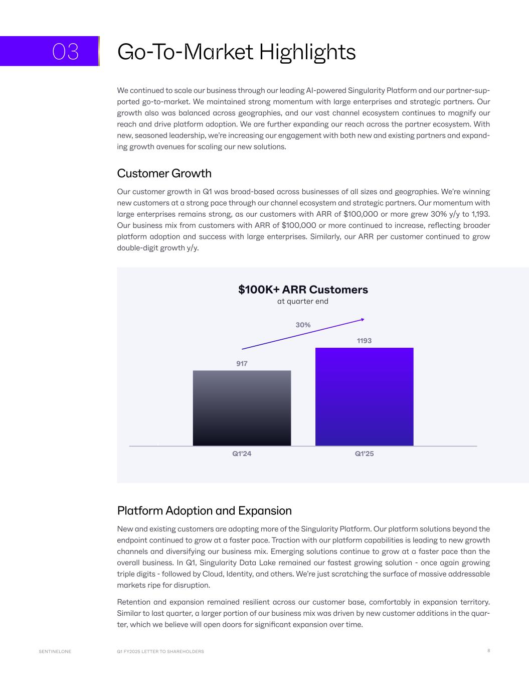 Q1 FY2025 Letter to SharehoLderSSENTINELONE 8 Go-To-Market Highlights We continued to scale our business through our leading AI-powered Singularity Platform and our partner-sup- ported go-to-market. We maintained strong momentum with large enterprises and strategic partners. Our growth also was balanced across geographies, and our vast channel ecosystem continues to magnify our reach and drive platform adoption. We are further expanding our reach across the partner ecosystem. With new, seasoned leadership, we’re increasing our engagement with both new and existing partners and expand- ing growth avenues for scaling our new solutions. Customer Growth Our customer growth in Q1 was broad-based across businesses of all sizes and geographies. We’re winning new customers at a strong pace through our channel ecosystem and strategic partners. Our momentum with large enterprises remains strong, as our customers with ARR of $100,000 or more grew 30% y/y to 1,193. Our business mix from customers with ARR of $100,000 or more continued to increase, reflecting broader platform adoption and success with large enterprises. Similarly, our ARR per customer continued to grow double-digit growth y/y. Q1'24 Q1'25 $100K+ ARR Customers at quarter end 917 30% 1193 Platform Adoption and Expansion New and existing customers are adopting more of the Singularity Platform. Our platform solutions beyond the endpoint continued to grow at a faster pace. Traction with our platform capabilities is leading to new growth channels and diversifying our business mix. Emerging solutions continue to grow at a faster pace than the overall business. In Q1, Singularity Data Lake remained our fastest growing solution - once again growing triple digits - followed by Cloud, Identity, and others. We’re just scratching the surface of massive addressable markets ripe for disruption. Retention and expansion remained resilient across our customer base, comfortably in expansion territory. Similar to last quarter, a larger portion of our business mix was driven by new customer additions in the quar- ter, which we believe will open doors for significant expansion over time. 03
