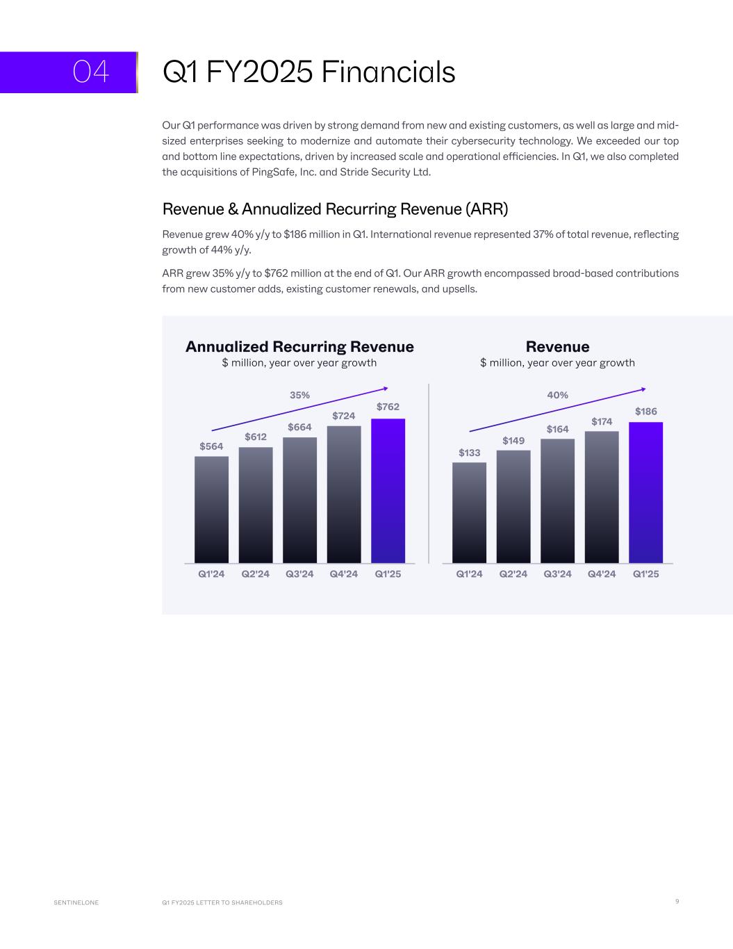 Q1 FY2025 Letter to SharehoLderSSENTINELONE 9 Q1 FY2025 Financials Our Q1 performance was driven by strong demand from new and existing customers, as well as large and mid- sized enterprises seeking to modernize and automate their cybersecurity technology. We exceeded our top and bottom line expectations, driven by increased scale and operational efficiencies. In Q1, we also completed the acquisitions of PingSafe, Inc. and Stride Security Ltd. Revenue & Annualized Recurring Revenue (ARR) Revenue grew 40% y/y to $186 million in Q1. International revenue represented 37% of total revenue, reflecting growth of 44% y/y. ARR grew 35% y/y to $762 million at the end of Q1. Our ARR growth encompassed broad-based contributions from new customer adds, existing customer renewals, and upsells. Q2'24Q1'24 Q3'24 Q4'24 Q1'25Q2'24Q1'24 Q3'24 Q4'24 Q1'25 Annualized Recurring Revenue $ million, year over year growth Revenue $ million, year over year growth $133 40% $149 $164 $174 $186 35% $564 $612 $664 $724 $762 04
