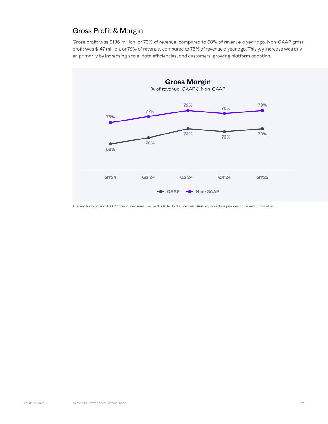 Q1 FY2025 Letter to SharehoLderSSENTINELONE 10 Gross Profit & Margin Gross profit was $136 million, or 73% of revenue, compared to 68% of revenue a year ago. Non-GAAP gross profit was $147 million, or 79% of revenue, compared to 75% of revenue a year ago. This y/y increase was driv- en primarily by increasing scale, data efficiencies, and customers’ growing platform adoption. GAAP Non-GAAP Q1'24 Q2'24 Q3'24 Q4'24 Q1'25 Gross Margin % of revenue, GAAP & Non-GAAP 75% 77% 79% 78% 79% 68% 70% 73% 72% 73% A reconciliation of non-GAAP financial measures used in this letter to their nearest GAAP equivalents is provided at the end of this letter.