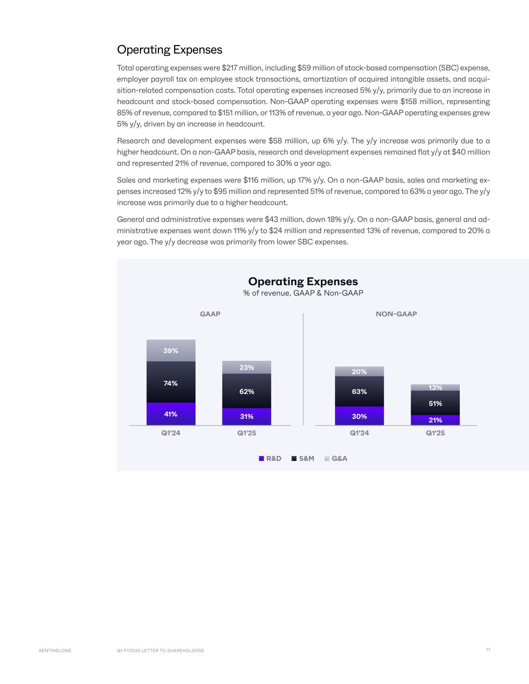 Q1 FY2025 Letter to SharehoLderSSENTINELONE 11 Operating Expenses Total operating expenses were $217 million, including $59 million of stock-based compensation (SBC) expense, employer payroll tax on employee stock transactions, amortization of acquired intangible assets, and acqui- sition-related compensation costs. Total operating expenses increased 5% y/y, primarily due to an increase in headcount and stock-based compensation. Non-GAAP operating expenses were $158 million, representing 85% of revenue, compared to $151 million, or 113% of revenue, a year ago. Non-GAAP operating expenses grew 5% y/y, driven by an increase in headcount. Research and development expenses were $58 million, up 6% y/y. The y/y increase was primarily due to a higher headcount. On a non-GAAP basis, research and development expenses remained flat y/y at $40 million and represented 21% of revenue, compared to 30% a year ago. Sales and marketing expenses were $116 million, up 17% y/y. On a non-GAAP basis, sales and marketing ex- penses increased 12% y/y to $95 million and represented 51% of revenue, compared to 63% a year ago. The y/y increase was primarily due to a higher headcount. General and administrative expenses were $43 million, down 18% y/y. On a non-GAAP basis, general and ad- ministrative expenses went down 11% y/y to $24 million and represented 13% of revenue, compared to 20% a year ago. The y/y decrease was primarily from lower SBC expenses. R&D S&M G&A Q1'24 Q1'25Q1'24 Q1'25 Operating Expenses % of revenue, GAAP & Non-GAAP GAAP NON-GAAP 31% 62% 23% 41% 74% 39% 21% 51% 13% 30% 63% 20%
