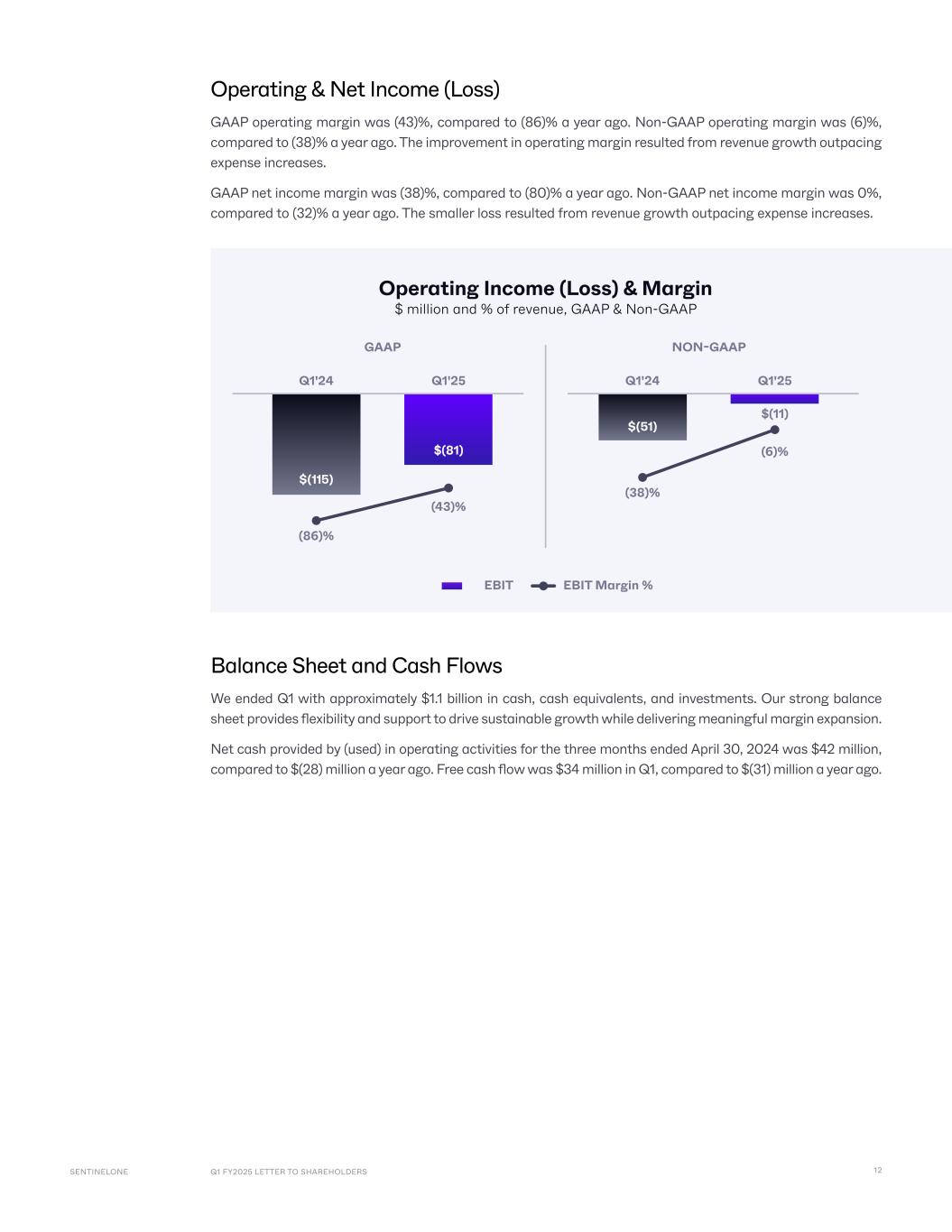 Q1 FY2025 Letter to SharehoLderSSENTINELONE 12 Operating & Net Income (Loss) GAAP operating margin was (43)%, compared to (86)% a year ago. Non-GAAP operating margin was (6)%, compared to (38)% a year ago. The improvement in operating margin resulted from revenue growth outpacing expense increases. GAAP net income margin was (38)%, compared to (80)% a year ago. Non-GAAP net income margin was 0%, compared to (32)% a year ago. The smaller loss resulted from revenue growth outpacing expense increases. EBIT EBIT Margin % Q1'24 Q1'25 Q1'24 Q1'25 Operating Income (Loss) & Margin $ million and % of revenue, GAAP & Non-GAAP GAAP NON-GAAP $(81) $(11) (38)% (6)% (43)% (86)% $(115) $(51) Balance Sheet and Cash Flows We ended Q1 with approximately $1.1 billion in cash, cash equivalents, and investments. Our strong balance sheet provides flexibility and support to drive sustainable growth while delivering meaningful margin expansion. Net cash provided by (used) in operating activities for the three months ended April 30, 2024 was $42 million, compared to $(28) million a year ago. Free cash flow was $34 million in Q1, compared to $(31) million a year ago.