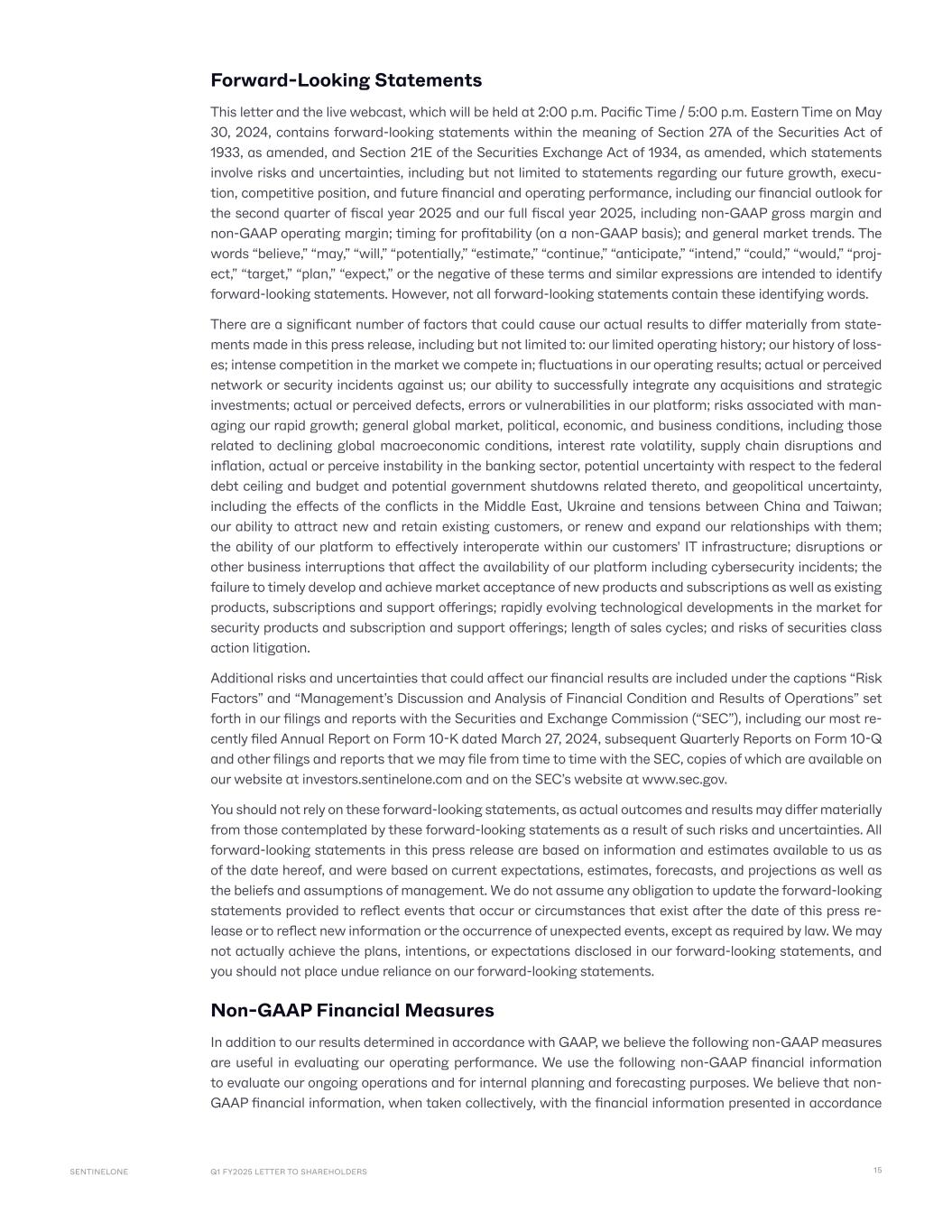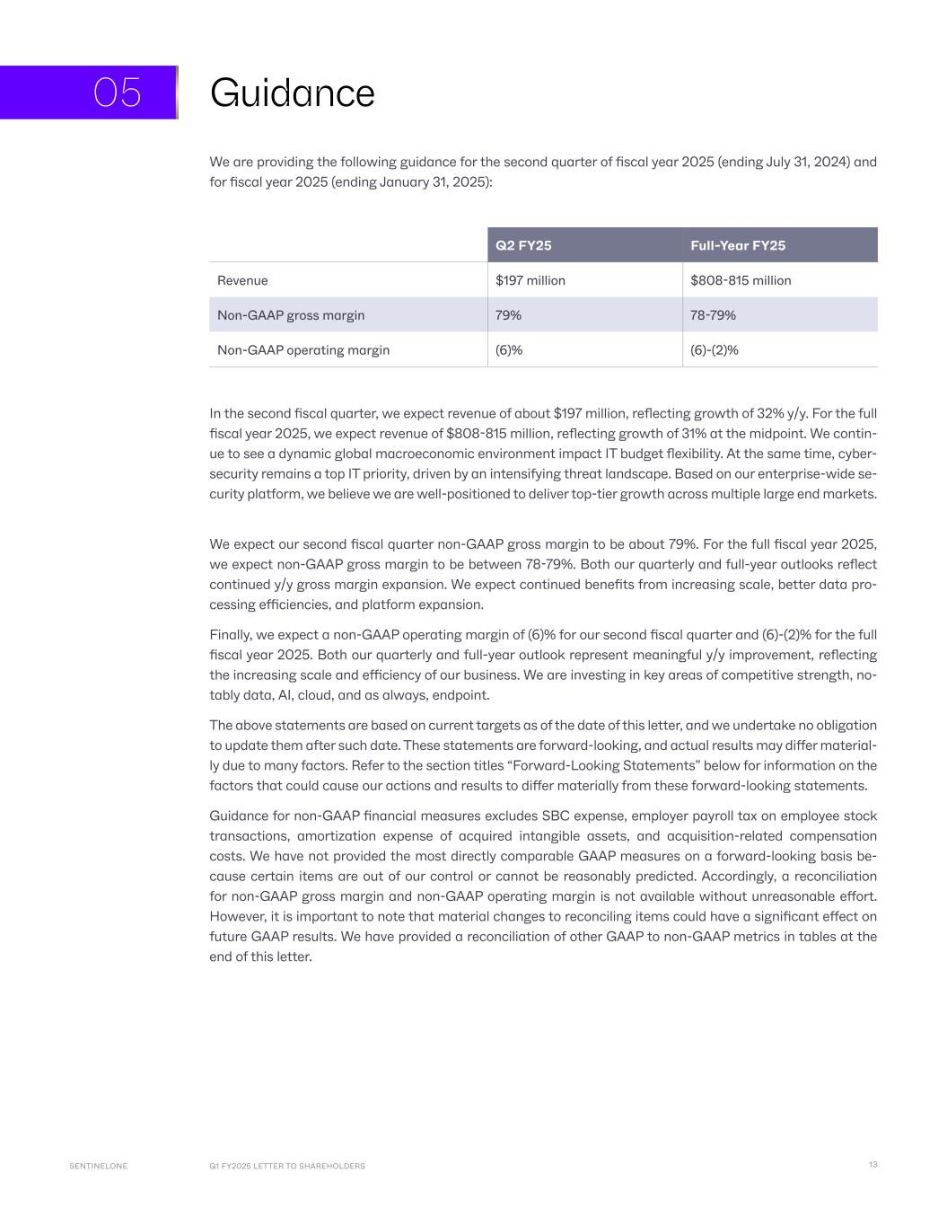 Q1 FY2025 Letter to SharehoLderSSENTINELONE 13 05 Guidance We are providing the following guidance for the second quarter of fiscal year 2025 (ending July 31, 2024) and for fiscal year 2025 (ending January 31, 2025): Q2 FY25 Full-Year FY25 Revenue $197 million $808-815 million Non-GAAP gross margin 79% 78-79% Non-GAAP operating margin (6)% (6)-(2)% In the second fiscal quarter, we expect revenue of about $197 million, reflecting growth of 32% y/y. For the full fiscal year 2025, we expect revenue of $808-815 million, reflecting growth of 31% at the midpoint. We contin- ue to see a dynamic global macroeconomic environment impact IT budget flexibility. At the same time, cyber- security remains a top IT priority, driven by an intensifying threat landscape. Based on our enterprise-wide se- curity platform, we believe we are well-positioned to deliver top-tier growth across multiple large end markets. We expect our second fiscal quarter non-GAAP gross margin to be about 79%. For the full fiscal year 2025, we expect non-GAAP gross margin to be between 78-79%. Both our quarterly and full-year outlooks reflect continued y/y gross margin expansion. We expect continued benefits from increasing scale, better data pro- cessing efficiencies, and platform expansion. Finally, we expect a non-GAAP operating margin of (6)% for our second fiscal quarter and (6)-(2)% for the full fiscal year 2025. Both our quarterly and full-year outlook represent meaningful y/y improvement, reflecting the increasing scale and efficiency of our business. We are investing in key areas of competitive strength, no- tably data, AI, cloud, and as always, endpoint. The above statements are based on current targets as of the date of this letter, and we undertake no obligation to update them after such date. These statements are forward-looking, and actual results may differ material- ly due to many factors. Refer to the section titles “Forward-Looking Statements” below for information on the factors that could cause our actions and results to differ materially from these forward-looking statements. Guidance for non-GAAP financial measures excludes SBC expense, employer payroll tax on employee stock transactions, amortization expense of acquired intangible assets, and acquisition-related compensation costs. We have not provided the most directly comparable GAAP measures on a forward-looking basis be- cause certain items are out of our control or cannot be reasonably predicted. Accordingly, a reconciliation for non-GAAP gross margin and non-GAAP operating margin is not available without unreasonable effort. However, it is important to note that material changes to reconciling items could have a significant effect on future GAAP results. We have provided a reconciliation of other GAAP to non-GAAP metrics in tables at the end of this letter.