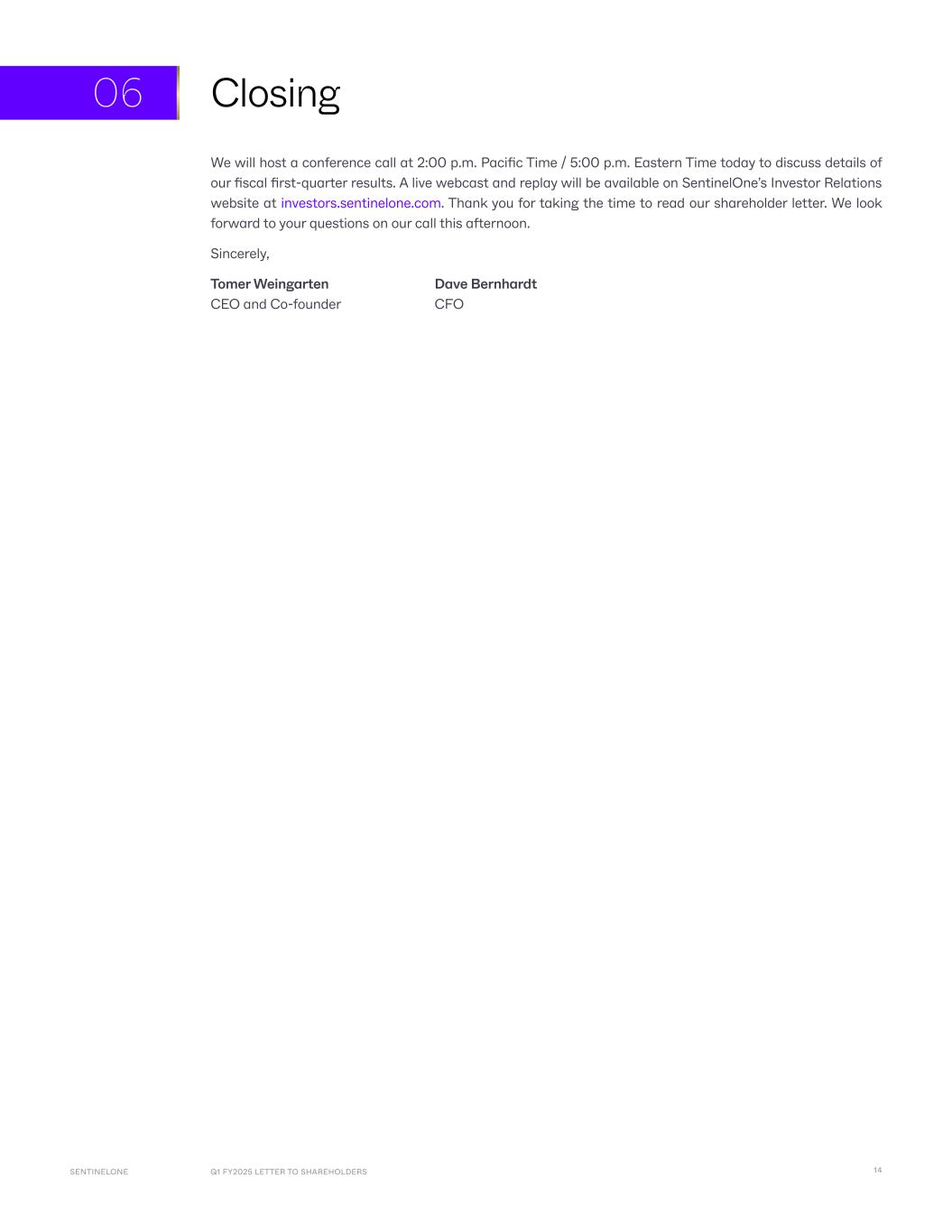 Q1 FY2025 Letter to SharehoLderSSENTINELONE 14 06 Closing We will host a conference call at 2:00 p.m. Pacific Time / 5:00 p.m. Eastern Time today to discuss details of our fiscal first-quarter results. A live webcast and replay will be available on SentinelOne’s Investor Relations website at investors.sentinelone.com. Thank you for taking the time to read our shareholder letter. We look forward to your questions on our call this afternoon. Sincerely, Tomer Weingarten Dave Bernhardt CEO and Co-founder CFO