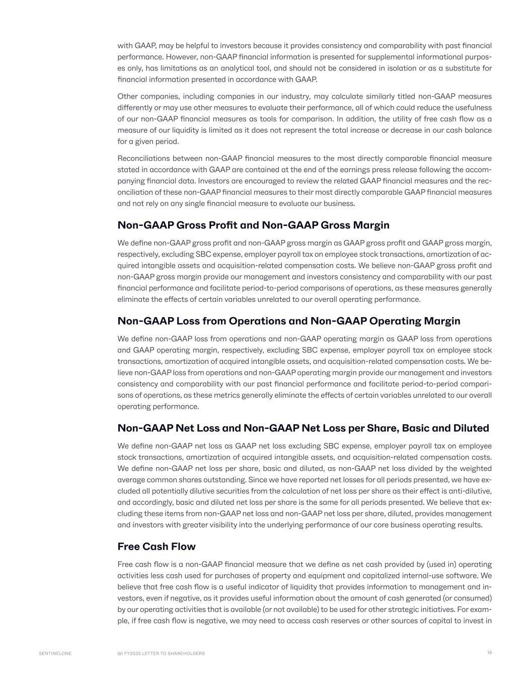Q1 FY2025 Letter to SharehoLderSSENTINELONE 16 with GAAP, may be helpful to investors because it provides consistency and comparability with past financial performance. However, non-GAAP financial information is presented for supplemental informational purpos- es only, has limitations as an analytical tool, and should not be considered in isolation or as a substitute for financial information presented in accordance with GAAP. Other companies, including companies in our industry, may calculate similarly titled non-GAAP measures differently or may use other measures to evaluate their performance, all of which could reduce the usefulness of our non-GAAP financial measures as tools for comparison. In addition, the utility of free cash flow as a measure of our liquidity is limited as it does not represent the total increase or decrease in our cash balance for a given period. Reconciliations between non-GAAP financial measures to the most directly comparable financial measure stated in accordance with GAAP are contained at the end of the earnings press release following the accom- panying financial data. Investors are encouraged to review the related GAAP financial measures and the rec- onciliation of these non-GAAP financial measures to their most directly comparable GAAP financial measures and not rely on any single financial measure to evaluate our business. Non-GAAP Gross Profit and Non-GAAP Gross Margin We define non-GAAP gross profit and non-GAAP gross margin as GAAP gross profit and GAAP gross margin, respectively, excluding SBC expense, employer payroll tax on employee stock transactions, amortization of ac- quired intangible assets and acquisition-related compensation costs. We believe non-GAAP gross profit and non-GAAP gross margin provide our management and investors consistency and comparability with our past financial performance and facilitate period-to-period comparisons of operations, as these measures generally eliminate the effects of certain variables unrelated to our overall operating performance. Non-GAAP Loss from Operations and Non-GAAP Operating Margin We define non-GAAP loss from operations and non-GAAP operating margin as GAAP loss from operations and GAAP operating margin, respectively, excluding SBC expense, employer payroll tax on employee stock transactions, amortization of acquired intangible assets, and acquisition-related compensation costs. We be- lieve non-GAAP loss from operations and non-GAAP operating margin provide our management and investors consistency and comparability with our past financial performance and facilitate period-to-period compari- sons of operations, as these metrics generally eliminate the effects of certain variables unrelated to our overall operating performance. Non-GAAP Net Loss and Non-GAAP Net Loss per Share, Basic and Diluted We define non-GAAP net loss as GAAP net loss excluding SBC expense, employer payroll tax on employee stock transactions, amortization of acquired intangible assets, and acquisition-related compensation costs. We define non-GAAP net loss per share, basic and diluted, as non-GAAP net loss divided by the weighted average common shares outstanding. Since we have reported net losses for all periods presented, we have ex- cluded all potentially dilutive securities from the calculation of net loss per share as their effect is anti-dilutive, and accordingly, basic and diluted net loss per share is the same for all periods presented. We believe that ex- cluding these items from non-GAAP net loss and non-GAAP net loss per share, diluted, provides management and investors with greater visibility into the underlying performance of our core business operating results. Free Cash Flow Free cash flow is a non-GAAP financial measure that we define as net cash provided by (used in) operating activities less cash used for purchases of property and equipment and capitalized internal-use software. We believe that free cash flow is a useful indicator of liquidity that provides information to management and in- vestors, even if negative, as it provides useful information about the amount of cash generated (or consumed) by our operating activities that is available (or not available) to be used for other strategic initiatives. For exam- ple, if free cash flow is negative, we may need to access cash reserves or other sources of capital to invest in