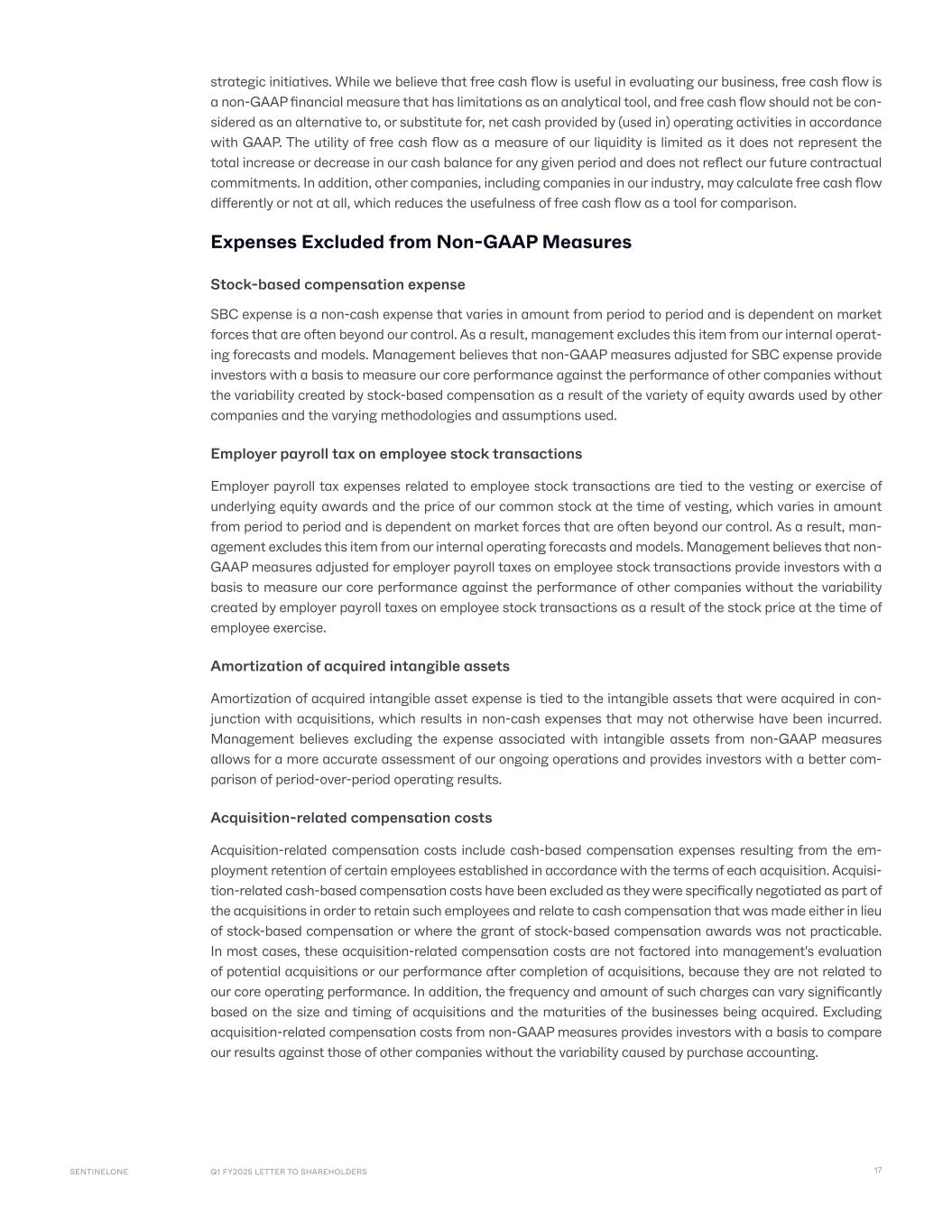 Q1 FY2025 Letter to SharehoLderSSENTINELONE 17 strategic initiatives. While we believe that free cash flow is useful in evaluating our business, free cash flow is a non-GAAP financial measure that has limitations as an analytical tool, and free cash flow should not be con- sidered as an alternative to, or substitute for, net cash provided by (used in) operating activities in accordance with GAAP. The utility of free cash flow as a measure of our liquidity is limited as it does not represent the total increase or decrease in our cash balance for any given period and does not reflect our future contractual commitments. In addition, other companies, including companies in our industry, may calculate free cash flow differently or not at all, which reduces the usefulness of free cash flow as a tool for comparison. Expenses Excluded from Non-GAAP Measures Stock-based compensation expense SBC expense is a non-cash expense that varies in amount from period to period and is dependent on market forces that are often beyond our control. As a result, management excludes this item from our internal operat- ing forecasts and models. Management believes that non-GAAP measures adjusted for SBC expense provide investors with a basis to measure our core performance against the performance of other companies without the variability created by stock-based compensation as a result of the variety of equity awards used by other companies and the varying methodologies and assumptions used. Employer payroll tax on employee stock transactions Employer payroll tax expenses related to employee stock transactions are tied to the vesting or exercise of underlying equity awards and the price of our common stock at the time of vesting, which varies in amount from period to period and is dependent on market forces that are often beyond our control. As a result, man- agement excludes this item from our internal operating forecasts and models. Management believes that non- GAAP measures adjusted for employer payroll taxes on employee stock transactions provide investors with a basis to measure our core performance against the performance of other companies without the variability created by employer payroll taxes on employee stock transactions as a result of the stock price at the time of employee exercise. Amortization of acquired intangible assets Amortization of acquired intangible asset expense is tied to the intangible assets that were acquired in con- junction with acquisitions, which results in non-cash expenses that may not otherwise have been incurred. Management believes excluding the expense associated with intangible assets from non-GAAP measures allows for a more accurate assessment of our ongoing operations and provides investors with a better com- parison of period-over-period operating results. Acquisition-related compensation costs Acquisition-related compensation costs include cash-based compensation expenses resulting from the em- ployment retention of certain employees established in accordance with the terms of each acquisition. Acquisi- tion-related cash-based compensation costs have been excluded as they were specifically negotiated as part of the acquisitions in order to retain such employees and relate to cash compensation that was made either in lieu of stock-based compensation or where the grant of stock-based compensation awards was not practicable. In most cases, these acquisition-related compensation costs are not factored into management's evaluation of potential acquisitions or our performance after completion of acquisitions, because they are not related to our core operating performance. In addition, the frequency and amount of such charges can vary significantly based on the size and timing of acquisitions and the maturities of the businesses being acquired. Excluding acquisition-related compensation costs from non-GAAP measures provides investors with a basis to compare our results against those of other companies without the variability caused by purchase accounting.