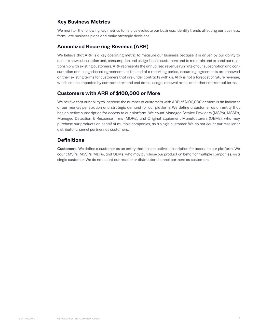 Q1 FY2025 Letter to SharehoLderSSENTINELONE 18 Key Business Metrics We monitor the following key metrics to help us evaluate our business, identify trends affecting our business, formulate business plans and make strategic decisions. Annualized Recurring Revenue (ARR) We believe that ARR is a key operating metric to measure our business because it is driven by our ability to acquire new subscription and, consumption and usage-based customers and to maintain and expand our rela- tionship with existing customers. ARR represents the annualized revenue run rate of our subscription and con- sumption and usage-based agreements at the end of a reporting period, assuming agreements are renewed on their existing terms for customers that are under contracts with us. ARR is not a forecast of future revenue, which can be impacted by contract start and end dates, usage, renewal rates, and other contractual terms. Customers with ARR of $100,000 or More We believe that our ability to increase the number of customers with ARR of $100,000 or more is an indicator of our market penetration and strategic demand for our platform. We define a customer as an entity that has an active subscription for access to our platform. We count Managed Service Providers (MSPs), MSSPs, Managed Detection & Response firms (MDRs), and Original Equipment Manufacturers (OEMs), who may purchase our products on behalf of multiple companies, as a single customer. We do not count our reseller or distributor channel partners as customers. Definitions Customers: We define a customer as an entity that has an active subscription for access to our platform. We count MSPs, MSSPs, MDRs, and OEMs, who may purchase our product on behalf of multiple companies, as a single customer. We do not count our reseller or distributor channel partners as customers.