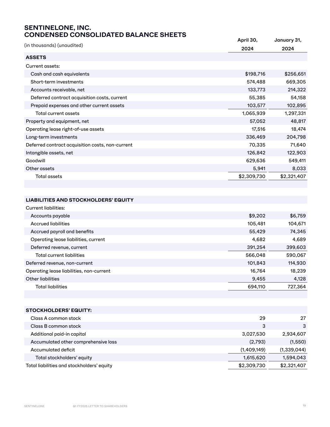 Q1 FY2025 Letter to SharehoLderSSENTINELONE 19 April 30, January 31, 2024 2024 ASSETS Current assets: Cash and cash equivalents $198,716 $256,651 Short-term investments 574,488 669,305 Accounts receivable, net 133,773 214,322 Deferred contract acquisition costs, current 55,385 54,158 Prepaid expenses and other current assets 103,577 102,895 Total current assets 1,065,939 1,297,331 Property and equipment, net 57,052 48,817 Operating lease right-of-use assets 17,516 18,474 Long-term investments 336,469 204,798 Deferred contract acquisition costs, non-current 70,335 71,640 Intangible assets, net 126,842 122,903 Goodwill 629,636 549,411 Other assets 5,941 8,033 Total assets $2,309,730 $2,321,407 LIABILITIES AND STOCKHOLDERS’ EQUITY Current liabilities: Accounts payable $9,202 $6,759 Accrued liabilities 105,481 104,671 Accrued payroll and benefits 55,429 74,345 Operating lease liabilities, current 4,682 4,689 Deferred revenue, current 391,254 399,603 Total current liabilities 566,048 590,067 Deferred revenue, non-current 101,843 114,930 Operating lease liabilities, non-current 16,764 18,239 Other liabilities 9,455 4,128 Total liabilities 694,110 727,364 STOCKHOLDERS’ EQUITY: Class A common stock 29 27 Class B common stock 3 3 Additional paid-in capital 3,027,530 2,934,607 Accumulated other comprehensive loss (2,793) (1,550) Accumulated deficit (1,409,149) (1,339,044) Total stockholders’ equity 1,615,620 1,594,043 Total liabilities and stockholders’ equity $2,309,730 $2,321,407 SENTINELONE, INC. CONDENSED CONSOLIDATED BALANCE SHEETS (in thousands) (unaudited)
