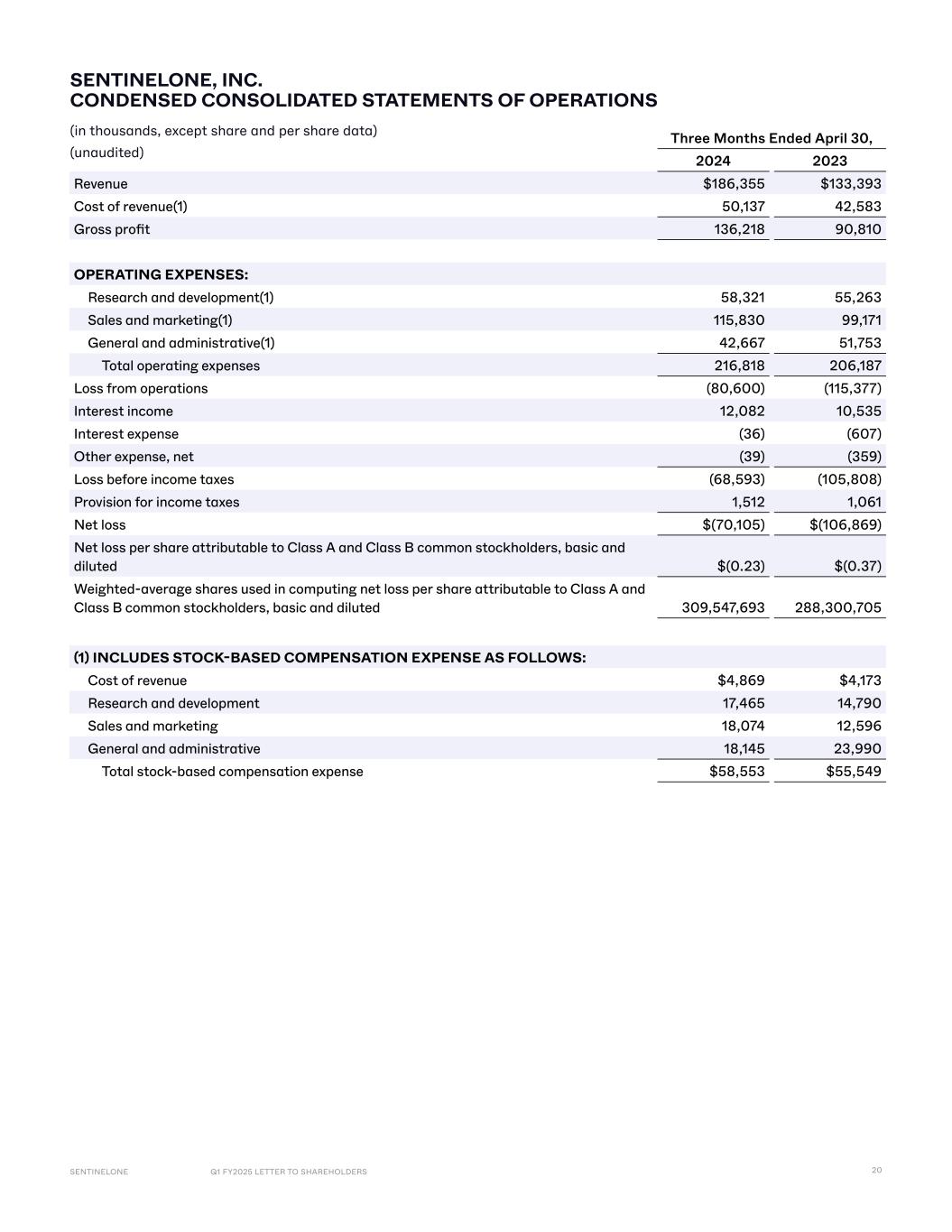 Q1 FY2025 Letter to SharehoLderSSENTINELONE 20 Three Months Ended April 30, 2024 2023 Revenue $186,355 $133,393 Cost of revenue(1) 50,137 42,583 Gross profit 136,218 90,810 OPERATING EXPENSES: Research and development(1) 58,321 55,263 Sales and marketing(1) 115,830 99,171 General and administrative(1) 42,667 51,753 Total operating expenses 216,818 206,187 Loss from operations (80,600) (115,377) Interest income 12,082 10,535 Interest expense (36) (607) Other expense, net (39) (359) Loss before income taxes (68,593) (105,808) Provision for income taxes 1,512 1,061 Net loss $(70,105) $(106,869) Net loss per share attributable to Class A and Class B common stockholders, basic and diluted $(0.23) $(0.37) Weighted-average shares used in computing net loss per share attributable to Class A and Class B common stockholders, basic and diluted 309,547,693 288,300,705 (1) INCLUDES STOCK-BASED COMPENSATION EXPENSE AS FOLLOWS: Cost of revenue $4,869 $4,173 Research and development 17,465 14,790 Sales and marketing 18,074 12,596 General and administrative 18,145 23,990 Total stock-based compensation expense $58,553 $55,549 SENTINELONE, INC. CONDENSED CONSOLIDATED STATEMENTS OF OPERATIONS (in thousands, except share and per share data) (unaudited)