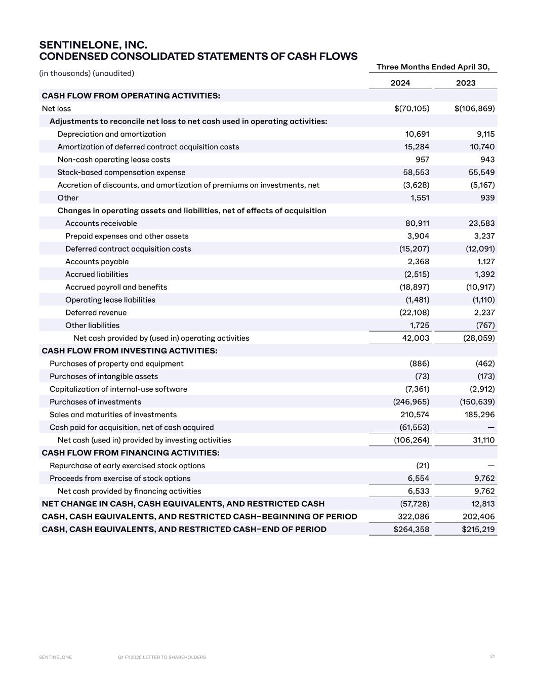 Q1 FY2025 Letter to SharehoLderSSENTINELONE 21 Three Months Ended April 30, 2024 2023 CASH FLOW FROM OPERATING ACTIVITIES: Net loss $(70,105) $(106,869) Adjustments to reconcile net loss to net cash used in operating activities: Depreciation and amortization 10,691 9,115 Amortization of deferred contract acquisition costs 15,284 10,740 Non-cash operating lease costs 957 943 Stock-based compensation expense 58,553 55,549 Accretion of discounts, and amortization of premiums on investments, net (3,628) (5,167) Other 1,551 939 Changes in operating assets and liabilities, net of effects of acquisition Accounts receivable 80,911 23,583 Prepaid expenses and other assets 3,904 3,237 Deferred contract acquisition costs (15,207) (12,091) Accounts payable 2,368 1,127 Accrued liabilities (2,515) 1,392 Accrued payroll and benefits (18,897) (10,917) Operating lease liabilities (1,481) (1,110) Deferred revenue (22,108) 2,237 Other liabilities 1,725 (767) Net cash provided by (used in) operating activities 42,003 (28,059) CASH FLOW FROM INVESTING ACTIVITIES: Purchases of property and equipment (886) (462) Purchases of intangible assets (73) (173) Capitalization of internal-use software (7,361) (2,912) Purchases of investments (246,965) (150,639) Sales and maturities of investments 210,574 185,296 Cash paid for acquisition, net of cash acquired (61,553) — Net cash (used in) provided by investing activities (106,264) 31,110 CASH FLOW FROM FINANCING ACTIVITIES: Repurchase of early exercised stock options (21) — Proceeds from exercise of stock options 6,554 9,762 Net cash provided by financing activities 6,533 9,762 NET CHANGE IN CASH, CASH EQUIVALENTS, AND RESTRICTED CASH (57,728) 12,813 CASH, CASH EQUIVALENTS, AND RESTRICTED CASH–BEGINNING OF PERIOD 322,086 202,406 CASH, CASH EQUIVALENTS, AND RESTRICTED CASH–END OF PERIOD $264,358 $215,219 SENTINELONE, INC. CONDENSED CONSOLIDATED STATEMENTS OF CASH FLOWS (in thousands) (unaudited)