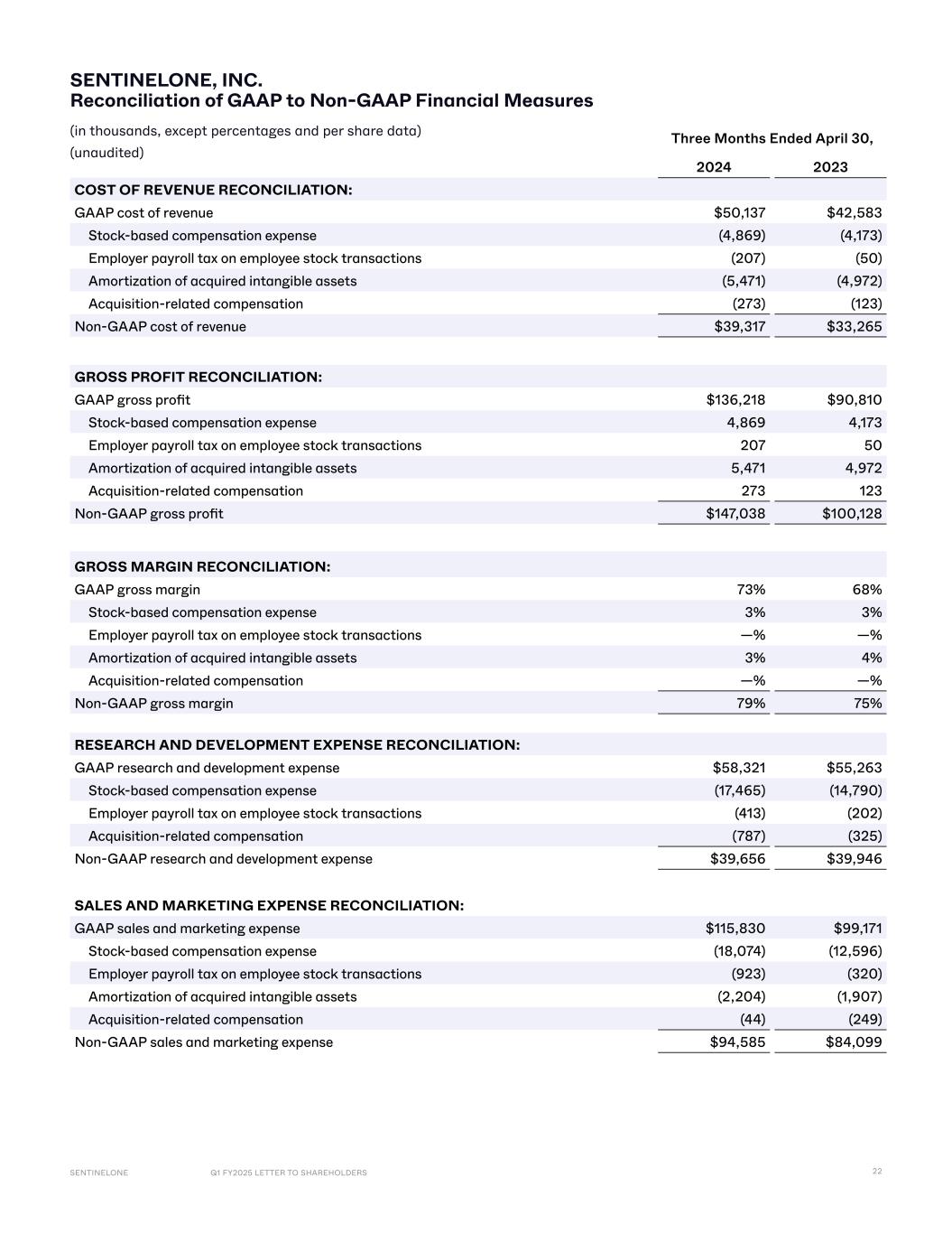 Q1 FY2025 Letter to SharehoLderSSENTINELONE 22 Three Months Ended April 30, 2024 2023 COST OF REVENUE RECONCILIATION: GAAP cost of revenue $50,137 $42,583 Stock-based compensation expense (4,869) (4,173) Employer payroll tax on employee stock transactions (207) (50) Amortization of acquired intangible assets (5,471) (4,972) Acquisition-related compensation (273) (123) Non-GAAP cost of revenue $39,317 $33,265 GROSS PROFIT RECONCILIATION: GAAP gross profit $136,218 $90,810 Stock-based compensation expense 4,869 4,173 Employer payroll tax on employee stock transactions 207 50 Amortization of acquired intangible assets 5,471 4,972 Acquisition-related compensation 273 123 Non-GAAP gross profit $147,038 $100,128 GROSS MARGIN RECONCILIATION: GAAP gross margin 73% 68% Stock-based compensation expense 3% 3% Employer payroll tax on employee stock transactions —% —% Amortization of acquired intangible assets 3% 4% Acquisition-related compensation —% —% Non-GAAP gross margin 79% 75% RESEARCH AND DEVELOPMENT EXPENSE RECONCILIATION: GAAP research and development expense $58,321 $55,263 Stock-based compensation expense (17,465) (14,790) Employer payroll tax on employee stock transactions (413) (202) Acquisition-related compensation (787) (325) Non-GAAP research and development expense $39,656 $39,946 SALES AND MARKETING EXPENSE RECONCILIATION: GAAP sales and marketing expense $115,830 $99,171 Stock-based compensation expense (18,074) (12,596) Employer payroll tax on employee stock transactions (923) (320) Amortization of acquired intangible assets (2,204) (1,907) Acquisition-related compensation (44) (249) Non-GAAP sales and marketing expense $94,585 $84,099 SENTINELONE, INC. Reconciliation of GAAP to Non-GAAP Financial Measures (in thousands, except percentages and per share data) (unaudited)