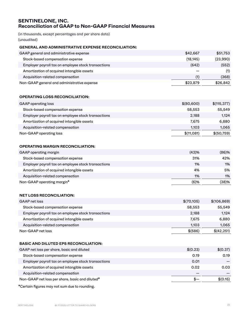 Q1 FY2025 Letter to SharehoLderSSENTINELONE 23 GENERAL AND ADMINISTRATIVE EXPENSE RECONCILIATION: GAAP general and administrative expense $42,667 $51,753 Stock-based compensation expense (18,145) (23,990) Employer payroll tax on employee stock transactions (642) (552) Amortization of acquired intangible assets — (1) Acquisition-related compensation (1) (368) Non-GAAP general and administrative expense $23,879 $26,842 OPERATING LOSS RECONCILIATION: GAAP operating loss $(80,600) $(115,377) Stock-based compensation expense 58,553 55,549 Employer payroll tax on employee stock transactions 2,188 1,124 Amortization of acquired intangible assets 7,675 6,880 Acquisition-related compensation 1,103 1,065 Non-GAAP operating loss $(11,081) $(50,759) OPERATING MARGIN RECONCILIATION: GAAP operating margin (43)% (86)% Stock-based compensation expense 31% 42% Employer payroll tax on employee stock transactions 1% 1% Amortization of acquired intangible assets 4% 5% Acquisition-related compensation 1% 1% Non-GAAP operating margin* (6)% (38)% NET LOSS RECONCILIATION: GAAP net loss $(70,105) $(106,869) Stock-based compensation expense 58,553 55,549 Employer payroll tax on employee stock transactions 2,188 1,124 Amortization of acquired intangible assets 7,675 6,880 Acquisition-related compensation 1,103 1,065 Non-GAAP net loss $(586) $(42,251) BASIC AND DILUTED EPS RECONCILIATION: GAAP net loss per share, basic and diluted $(0.23) $(0.37) Stock-based compensation expense 0.19 0.19 Employer payroll tax on employee stock transactions 0.01 — Amortization of acquired intangible assets 0.02 0.03 Acquisition-related compensation — — Non-GAAP net loss per share, basic and diluted* $— $(0.15) *Certain figures may not sum due to rounding. SENTINELONE, INC. Reconciliation of GAAP to Non-GAAP Financial Measures (in thousands, except percentages and per share data) (unaudited)
