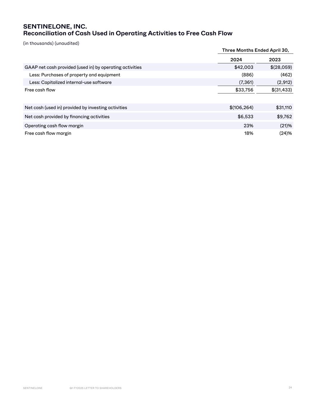 Q1 FY2025 Letter to SharehoLderSSENTINELONE 24 Three Months Ended April 30, 2024 2023 GAAP net cash provided (used in) by operating activities $42,003 $(28,059) Less: Purchases of property and equipment (886) (462) Less: Capitalized internal-use software (7,361) (2,912) Free cash flow $33,756 $(31,433) Net cash (used in) provided by investing activities $(106,264) $31,110 Net cash provided by financing activities $6,533 $9,762 Operating cash flow margin 23% (21)% Free cash flow margin 18% (24)% SENTINELONE, INC. Reconciliation of Cash Used in Operating Activities to Free Cash Flow (in thousands) (unaudited)