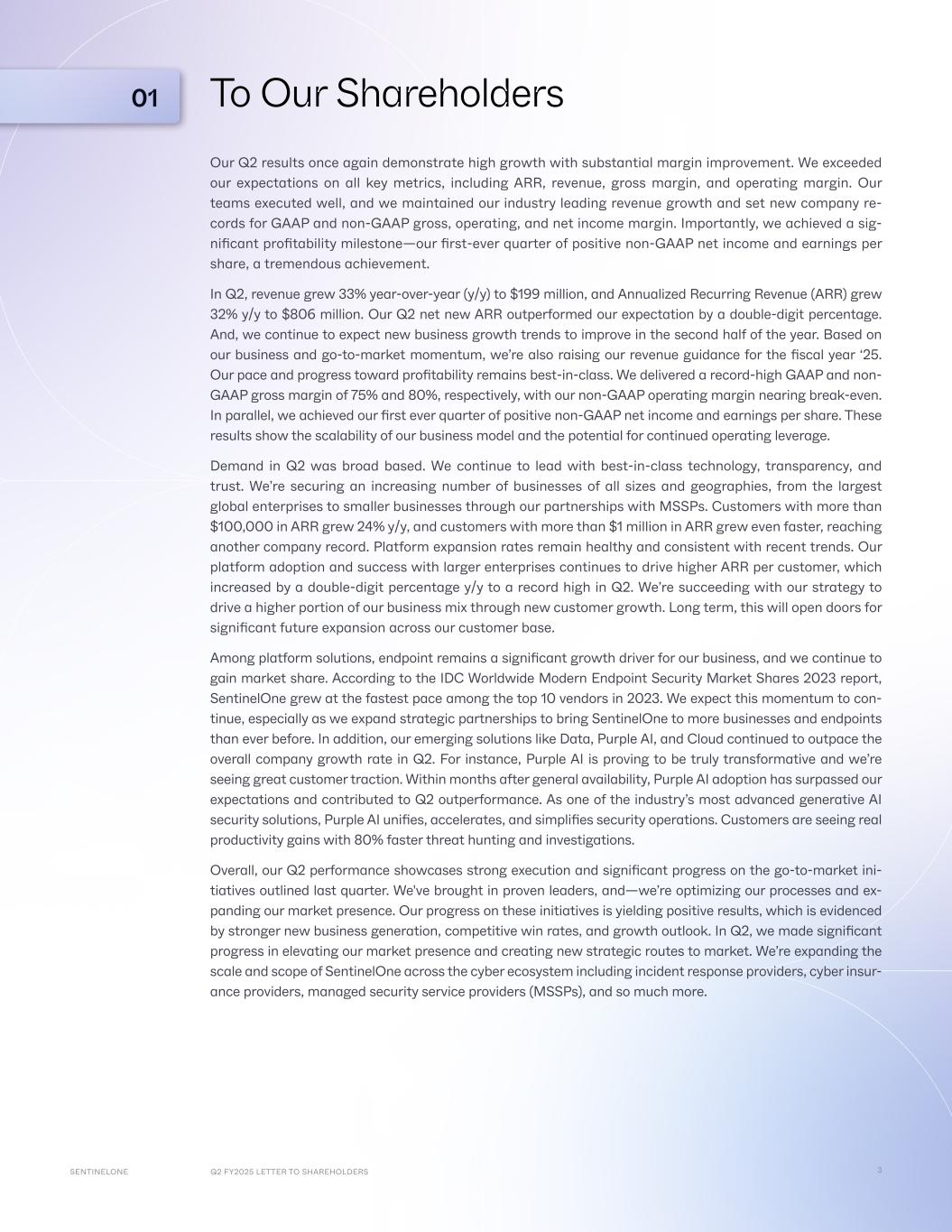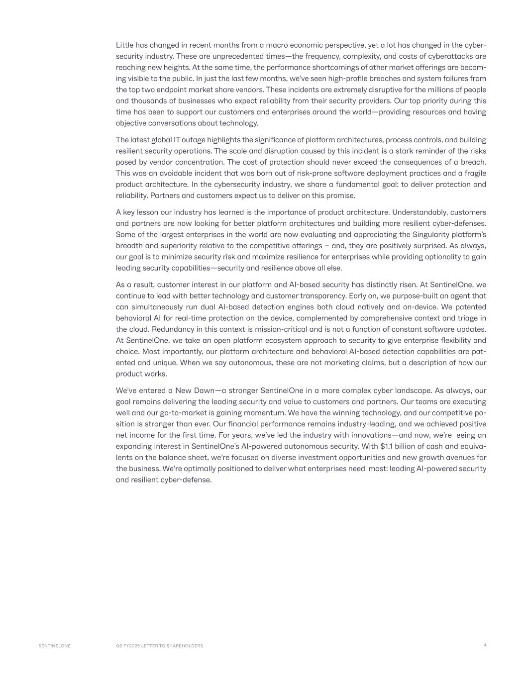 Q2 FY2025 Letter to SharehoLderSSENTINELONE 4 Little has changed in recent months from a macro economic perspective, yet a lot has changed in the cyber- security industry. These are unprecedented times—the frequency, complexity, and costs of cyberattacks are reaching new heights. At the same time, the performance shortcomings of other market offerings are becom- ing visible to the public. In just the last few months, we’ve seen high-profile breaches and system failures from the top two endpoint market share vendors. These incidents are extremely disruptive for the millions of people and thousands of businesses who expect reliability from their security providers. Our top priority during this time has been to support our customers and enterprises around the world—providing resources and having objective conversations about technology. The latest global IT outage highlights the significance of platform architectures, process controls, and building resilient security operations. The scale and disruption caused by this incident is a stark reminder of the risks posed by vendor concentration. The cost of protection should never exceed the consequences of a breach. This was an avoidable incident that was born out of risk-prone software deployment practices and a fragile product architecture. In the cybersecurity industry, we share a fundamental goal: to deliver protection and reliability. Partners and customers expect us to deliver on this promise. A key lesson our industry has learned is the importance of product architecture. Understandably, customers and partners are now looking for better platform architectures and building more resilient cyber-defenses. Some of the largest enterprises in the world are now evaluating and appreciating the Singularity platform’s breadth and superiority relative to the competitive offerings – and, they are positively surprised. As always, our goal is to minimize security risk and maximize resilience for enterprises while providing optionality to gain leading security capabilities—security and resilience above all else. As a result, customer interest in our platform and AI-based security has distinctly risen. At SentinelOne, we continue to lead with better technology and customer transparency. Early on, we purpose-built an agent that can simultaneously run dual AI-based detection engines both cloud natively and on-device. We patented behavioral AI for real-time protection on the device, complemented by comprehensive context and triage in the cloud. Redundancy in this context is mission-critical and is not a function of constant software updates. At SentinelOne, we take an open platform ecosystem approach to security to give enterprise flexibility and choice. Most importantly, our platform architecture and behavioral AI-based detection capabilities are pat- ented and unique. When we say autonomous, these are not marketing claims, but a description of how our product works. We’ve entered a New Dawn—a stronger SentinelOne in a more complex cyber landscape. As always, our goal remains delivering the leading security and value to customers and partners. Our teams are executing well and our go-to-market is gaining momentum. We have the winning technology, and our competitive po- sition is stronger than ever. Our financial performance remains industry-leading, and we achieved positive net income for the first time. For years, we’ve led the industry with innovations—and now, we’re seeing an expanding interest in SentinelOne’s AI-powered autonomous security. With $1.1 billion of cash and equiva- lents on the balance sheet, we’re focused on diverse investment opportunities and new growth avenues for the business. We’re optimally positioned to deliver what enterprises need most: leading AI-powered security and resilient cyber-defense.