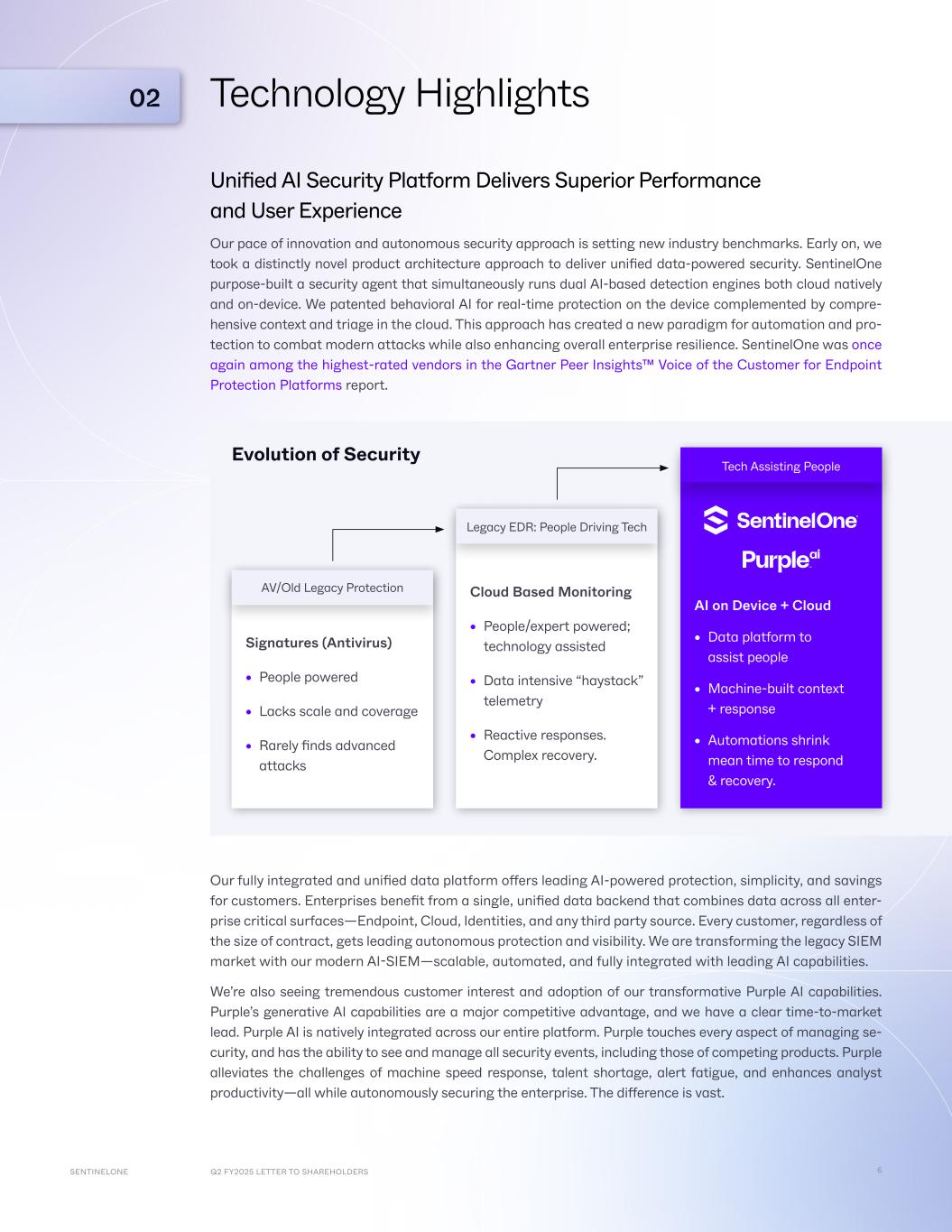Q2 FY2025 Letter to SharehoLderSSENTINELONE 6 02 Technology Highlights Unified AI Security Platform Delivers Superior Performance and User Experience Our pace of innovation and autonomous security approach is setting new industry benchmarks. Early on, we took a distinctly novel product architecture approach to deliver unified data-powered security. SentinelOne purpose-built a security agent that simultaneously runs dual AI-based detection engines both cloud natively and on-device. We patented behavioral AI for real-time protection on the device complemented by compre- hensive context and triage in the cloud. This approach has created a new paradigm for automation and pro- tection to combat modern attacks while also enhancing overall enterprise resilience. SentinelOne was once again among the highest-rated vendors in the Gartner Peer Insights™ Voice of the Customer for Endpoint Protection Platforms report. Our fully integrated and unified data platform offers leading AI-powered protection, simplicity, and savings for customers. Enterprises benefit from a single, unified data backend that combines data across all enter- prise critical surfaces—Endpoint, Cloud, Identities, and any third party source. Every customer, regardless of the size of contract, gets leading autonomous protection and visibility. We are transforming the legacy SIEM market with our modern AI-SIEM—scalable, automated, and fully integrated with leading AI capabilities. We’re also seeing tremendous customer interest and adoption of our transformative Purple AI capabilities. Purple’s generative AI capabilities are a major competitive advantage, and we have a clear time-to-market lead. Purple AI is natively integrated across our entire platform. Purple touches every aspect of managing se- curity, and has the ability to see and manage all security events, including those of competing products. Purple alleviates the challenges of machine speed response, talent shortage, alert fatigue, and enhances analyst productivity—all while autonomously securing the enterprise. The difference is vast. Signatures (Antivirus) • People powered • Lacks scale and coverage • Rarely finds advanced attacks AV/Old Legacy Protection Cloud Based Monitoring • People/expert powered; technology assisted • Data intensive “haystack” telemetry • Reactive responses. Complex recovery. Legacy EDR: People Driving Tech AI on Device + Cloud • Data platform to assist people • Machine-built context + response • Automations shrink mean time to respond & recovery. Tech Assisting People Evolution of Security