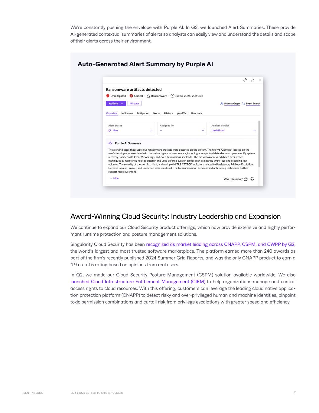 Q2 FY2025 Letter to SharehoLderSSENTINELONE 7 We’re constantly pushing the envelope with Purple AI. In Q2, we launched Alert Summaries. These provide AI-generated contextual summaries of alerts so analysts can easily view and understand the details and scope of their alerts across their environment. Award-Winning Cloud Security: Industry Leadership and Expansion We continue to expand our Cloud Security product offerings, which now provide extensive and highly perfor- mant runtime protection and posture management solutions. Singularity Cloud Security has been recognized as market leading across CNAPP, CSPM, and CWPP by G2, the world’s largest and most trusted software marketplace. The platform earned more than 240 awards as part of the firm’s recently published 2024 Summer Grid Reports, and was the only CNAPP product to earn a 4.9 out of 5 rating based on opinions from real users. In Q2, we made our Cloud Security Posture Management (CSPM) solution available worldwide. We also launched Cloud Infrastructure Entitlement Management (CIEM) to help organizations manage and control access rights to cloud resources. With this offering, customers can leverage the leading cloud native applica- tion protection platform (CNAPP) to detect risky and over-privileged human and machine identities, pinpoint toxic permission combinations and curtail risk from privilege escalations with greater speed and efficiency. Auto-Generated Alert Summary by Purple AI
