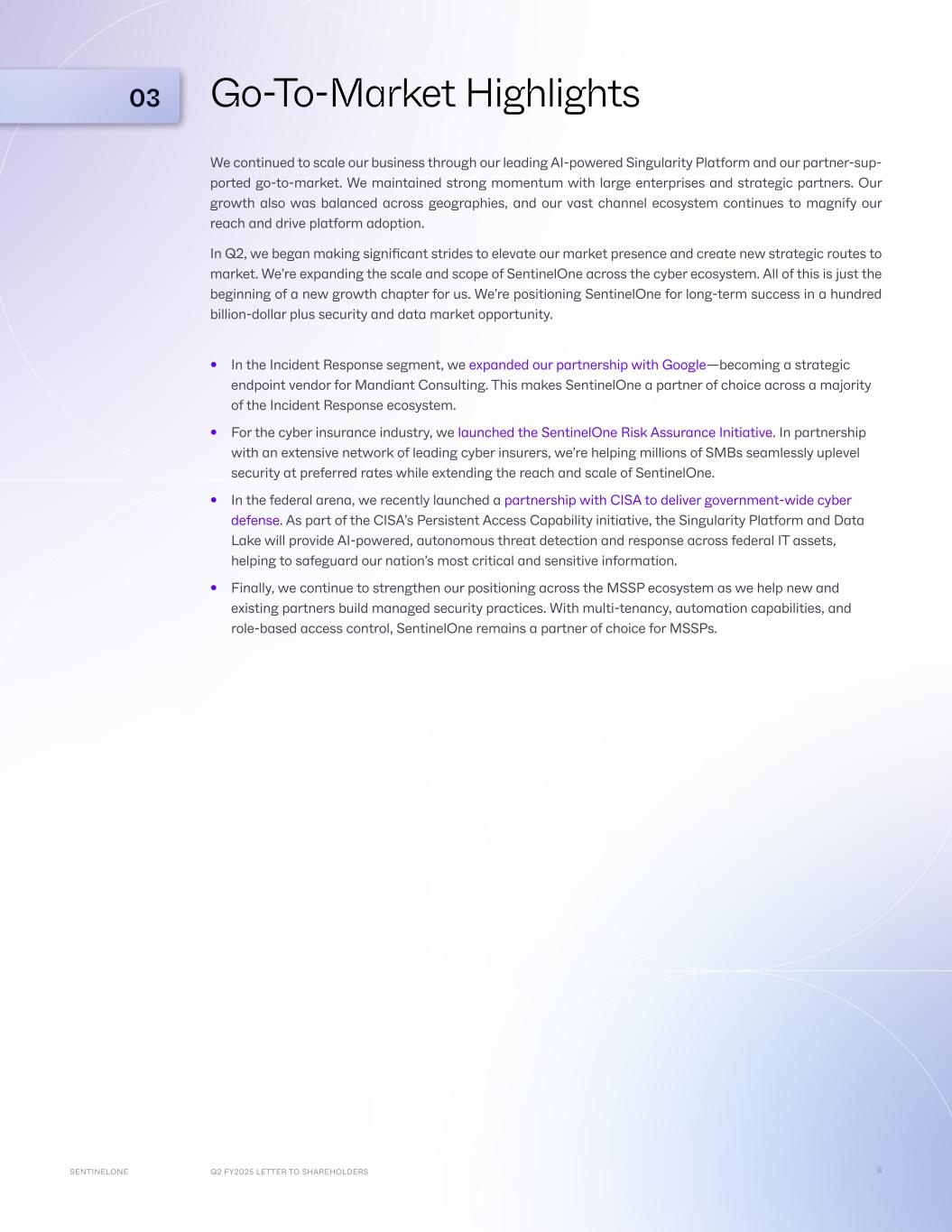 Q2 FY2025 Letter to SharehoLderSSENTINELONE 8 03 Go-To-Market Highlights We continued to scale our business through our leading AI-powered Singularity Platform and our partner-sup- ported go-to-market. We maintained strong momentum with large enterprises and strategic partners. Our growth also was balanced across geographies, and our vast channel ecosystem continues to magnify our reach and drive platform adoption. In Q2, we began making significant strides to elevate our market presence and create new strategic routes to market. We’re expanding the scale and scope of SentinelOne across the cyber ecosystem. All of this is just the beginning of a new growth chapter for us. We’re positioning SentinelOne for long-term success in a hundred billion-dollar plus security and data market opportunity. • In the Incident Response segment, we expanded our partnership with Google—becoming a strategic endpoint vendor for Mandiant Consulting. This makes SentinelOne a partner of choice across a majority of the Incident Response ecosystem. • For the cyber insurance industry, we launched the SentinelOne Risk Assurance Initiative. In partnership with an extensive network of leading cyber insurers, we’re helping millions of SMBs seamlessly uplevel security at preferred rates while extending the reach and scale of SentinelOne. • In the federal arena, we recently launched a partnership with CISA to deliver government-wide cyber defense. As part of the CISA’s Persistent Access Capability initiative, the Singularity Platform and Data Lake will provide AI-powered, autonomous threat detection and response across federal IT assets, helping to safeguard our nation’s most critical and sensitive information. • Finally, we continue to strengthen our positioning across the MSSP ecosystem as we help new and existing partners build managed security practices. With multi-tenancy, automation capabilities, and role-based access control, SentinelOne remains a partner of choice for MSSPs.