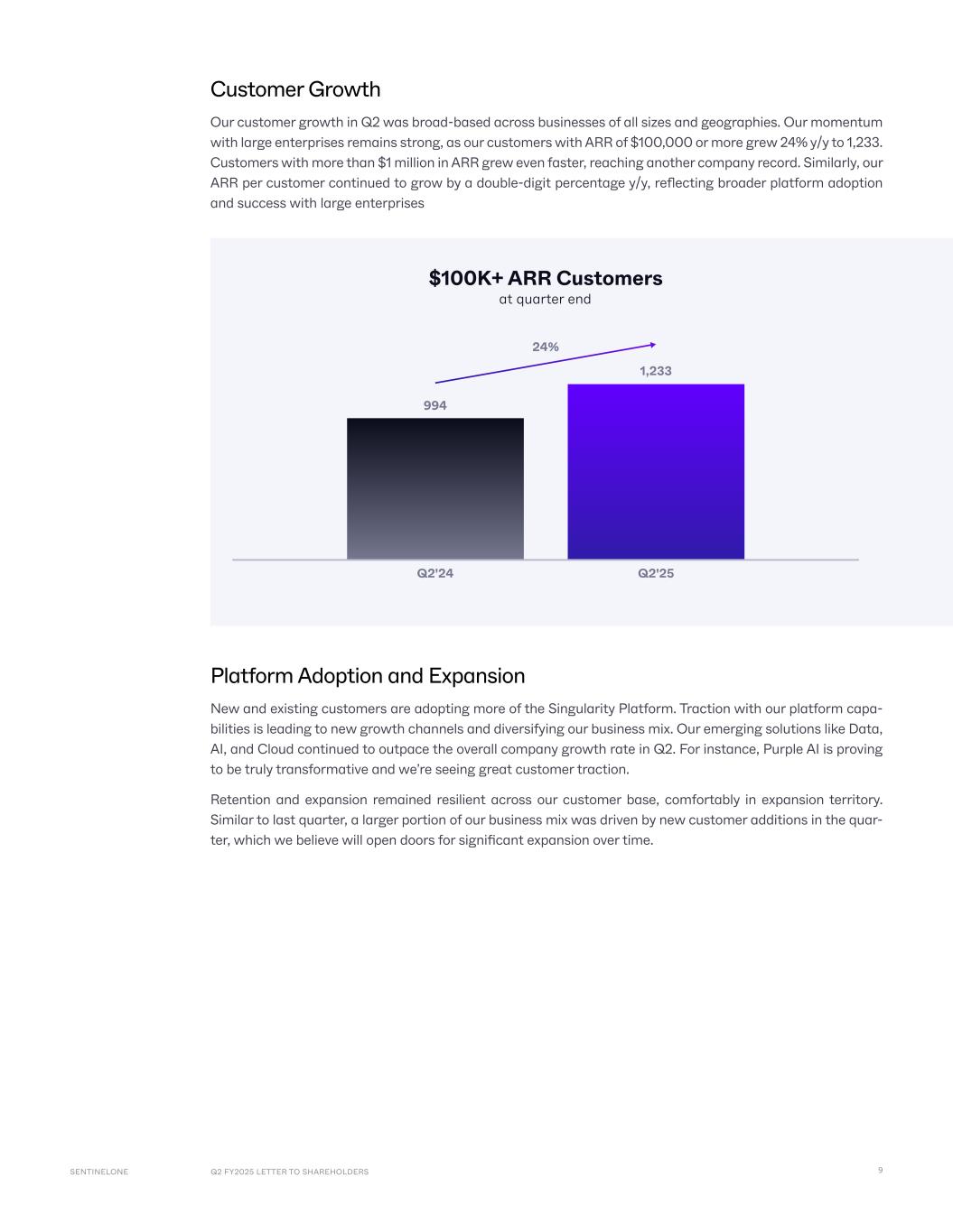 Q2 FY2025 Letter to SharehoLderSSENTINELONE 9 Customer Growth Our customer growth in Q2 was broad-based across businesses of all sizes and geographies. Our momentum with large enterprises remains strong, as our customers with ARR of $100,000 or more grew 24% y/y to 1,233. Customers with more than $1 million in ARR grew even faster, reaching another company record. Similarly, our ARR per customer continued to grow by a double-digit percentage y/y, reflecting broader platform adoption and success with large enterprises Q2'24 Q2'25 $100K+ ARR Customers at quarter end 994 24% 1,233 Platform Adoption and Expansion New and existing customers are adopting more of the Singularity Platform. Traction with our platform capa- bilities is leading to new growth channels and diversifying our business mix. Our emerging solutions like Data, AI, and Cloud continued to outpace the overall company growth rate in Q2. For instance, Purple AI is proving to be truly transformative and we’re seeing great customer traction. Retention and expansion remained resilient across our customer base, comfortably in expansion territory. Similar to last quarter, a larger portion of our business mix was driven by new customer additions in the quar- ter, which we believe will open doors for significant expansion over time.