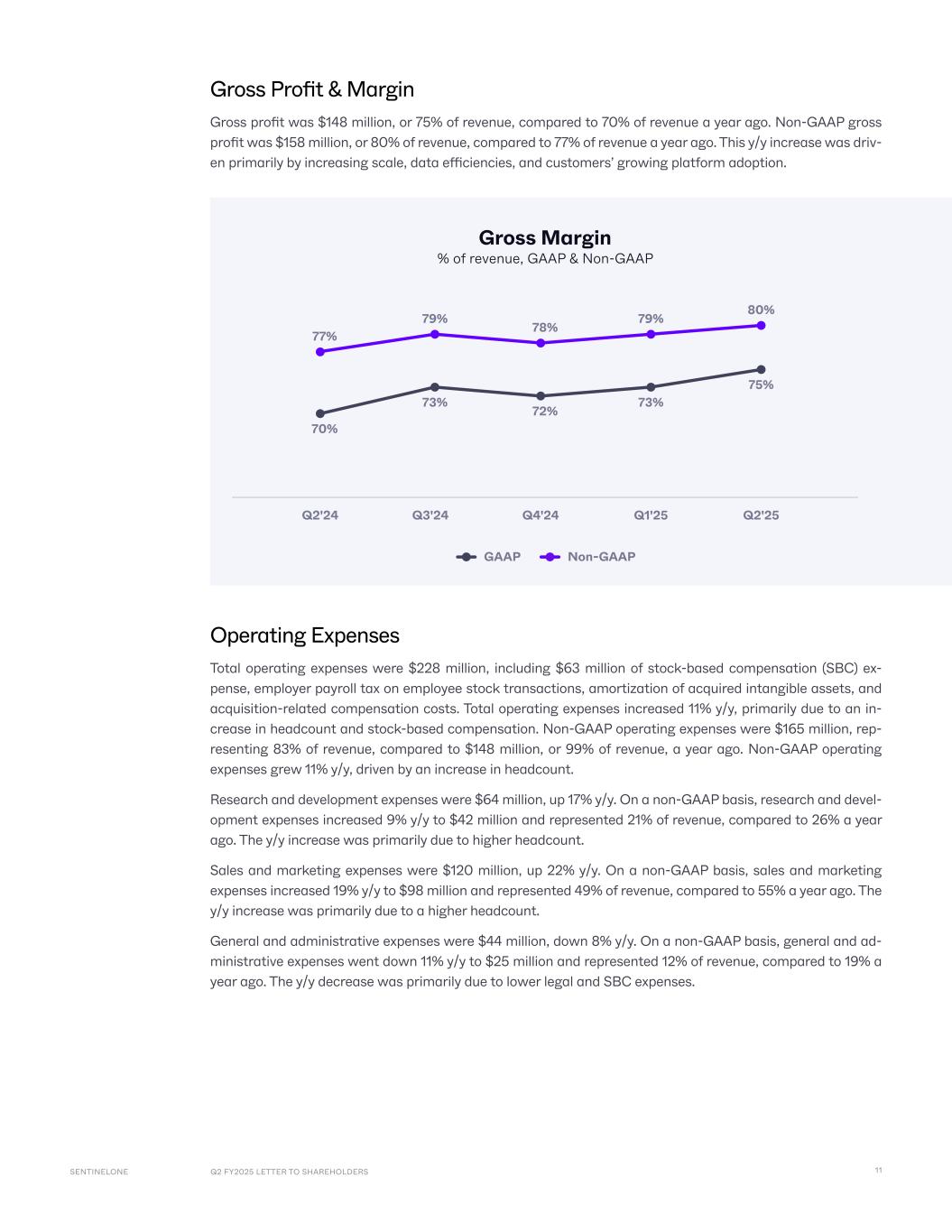 Q2 FY2025 Letter to SharehoLderSSENTINELONE 11 Gross Profit & Margin Gross profit was $148 million, or 75% of revenue, compared to 70% of revenue a year ago. Non-GAAP gross profit was $158 million, or 80% of revenue, compared to 77% of revenue a year ago. This y/y increase was driv- en primarily by increasing scale, data efficiencies, and customers’ growing platform adoption. GAAP Non-GAAP Q2'24 Q3'24 Q4'24 Q1'25 Q2'25 Gross Margin % of revenue, GAAP & Non-GAAP 77% 79% 78% 79% 70% 73% 72% 73% 80% 75% Operating Expenses Total operating expenses were $228 million, including $63 million of stock-based compensation (SBC) ex- pense, employer payroll tax on employee stock transactions, amortization of acquired intangible assets, and acquisition-related compensation costs. Total operating expenses increased 11% y/y, primarily due to an in- crease in headcount and stock-based compensation. Non-GAAP operating expenses were $165 million, rep- resenting 83% of revenue, compared to $148 million, or 99% of revenue, a year ago. Non-GAAP operating expenses grew 11% y/y, driven by an increase in headcount. Research and development expenses were $64 million, up 17% y/y. On a non-GAAP basis, research and devel- opment expenses increased 9% y/y to $42 million and represented 21% of revenue, compared to 26% a year ago. The y/y increase was primarily due to higher headcount. Sales and marketing expenses were $120 million, up 22% y/y. On a non-GAAP basis, sales and marketing expenses increased 19% y/y to $98 million and represented 49% of revenue, compared to 55% a year ago. The y/y increase was primarily due to a higher headcount. General and administrative expenses were $44 million, down 8% y/y. On a non-GAAP basis, general and ad- ministrative expenses went down 11% y/y to $25 million and represented 12% of revenue, compared to 19% a year ago. The y/y decrease was primarily due to lower legal and SBC expenses.
