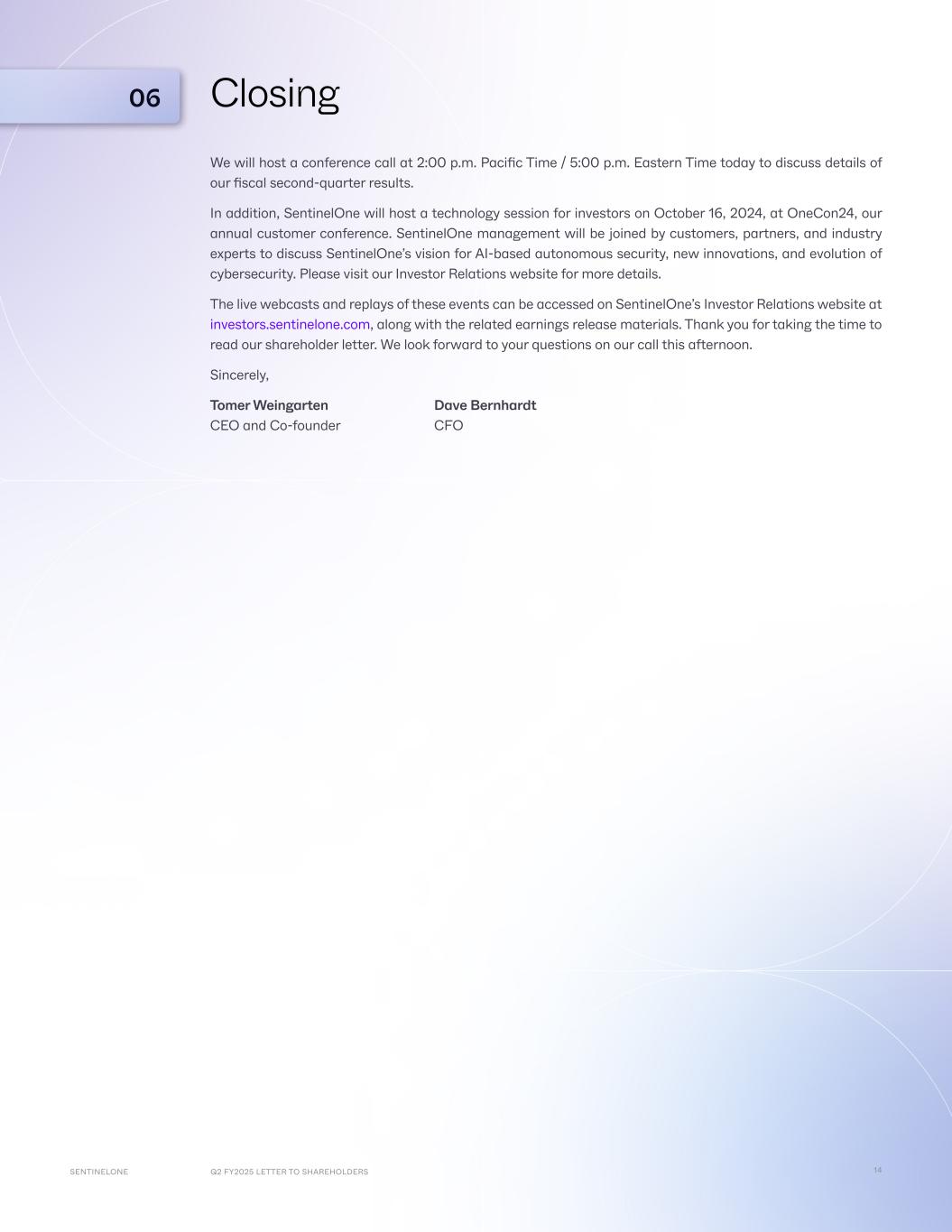 Q2 FY2025 Letter to SharehoLderSSENTINELONE 14 06 Closing We will host a conference call at 2:00 p.m. Pacific Time / 5:00 p.m. Eastern Time today to discuss details of our fiscal second-quarter results. In addition, SentinelOne will host a technology session for investors on October 16, 2024, at OneCon24, our annual customer conference. SentinelOne management will be joined by customers, partners, and industry experts to discuss SentinelOne’s vision for AI-based autonomous security, new innovations, and evolution of cybersecurity. Please visit our Investor Relations website for more details. The live webcasts and replays of these events can be accessed on SentinelOne’s Investor Relations website at investors.sentinelone.com, along with the related earnings release materials. Thank you for taking the time to read our shareholder letter. We look forward to your questions on our call this afternoon. Sincerely, Tomer Weingarten Dave Bernhardt CEO and Co-founder CFO