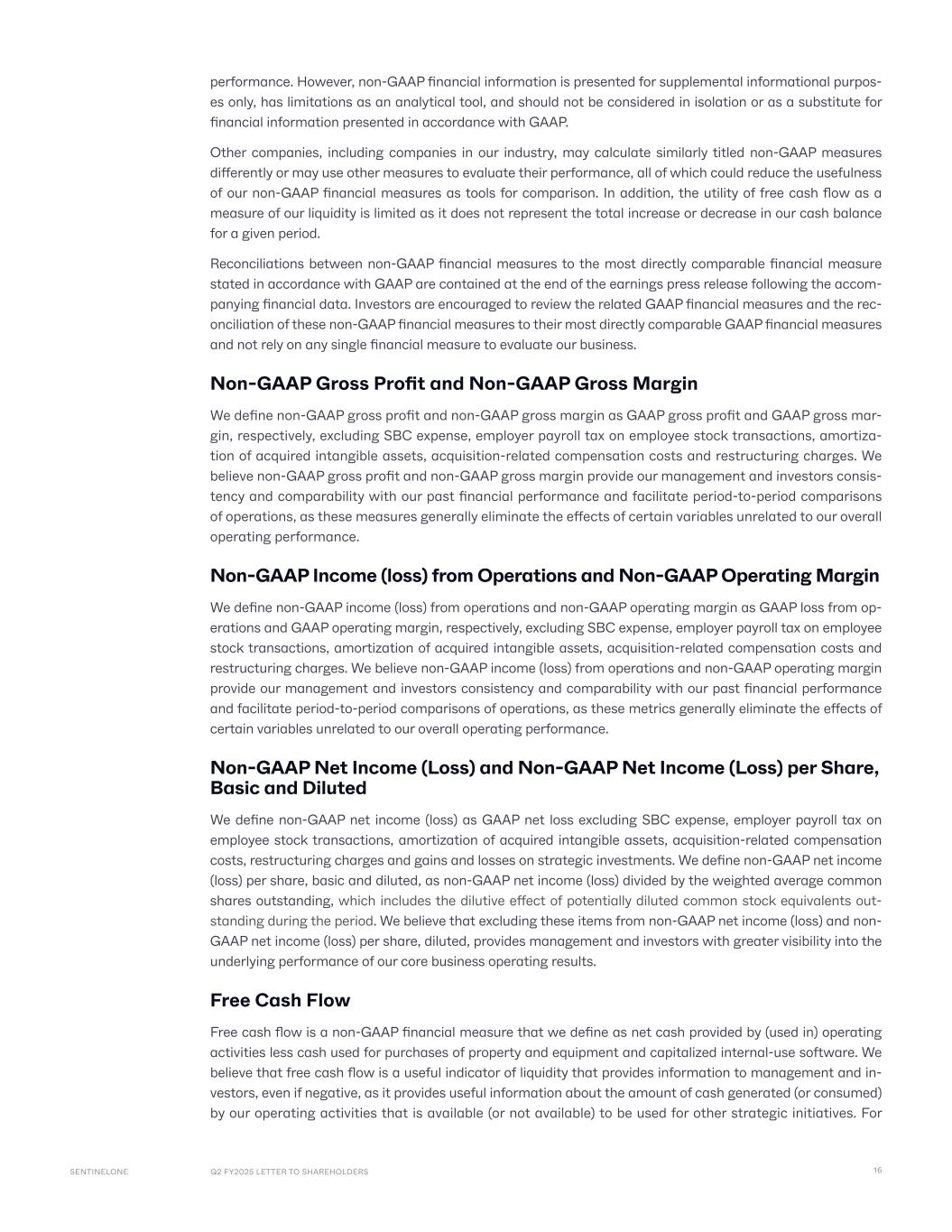 Q2 FY2025 Letter to SharehoLderSSENTINELONE 16 performance. However, non-GAAP financial information is presented for supplemental informational purpos- es only, has limitations as an analytical tool, and should not be considered in isolation or as a substitute for financial information presented in accordance with GAAP. Other companies, including companies in our industry, may calculate similarly titled non-GAAP measures differently or may use other measures to evaluate their performance, all of which could reduce the usefulness of our non-GAAP financial measures as tools for comparison. In addition, the utility of free cash flow as a measure of our liquidity is limited as it does not represent the total increase or decrease in our cash balance for a given period. Reconciliations between non-GAAP financial measures to the most directly comparable financial measure stated in accordance with GAAP are contained at the end of the earnings press release following the accom- panying financial data. Investors are encouraged to review the related GAAP financial measures and the rec- onciliation of these non-GAAP financial measures to their most directly comparable GAAP financial measures and not rely on any single financial measure to evaluate our business. Non-GAAP Gross Profit and Non-GAAP Gross Margin We define non-GAAP gross profit and non-GAAP gross margin as GAAP gross profit and GAAP gross mar- gin, respectively, excluding SBC expense, employer payroll tax on employee stock transactions, amortiza- tion of acquired intangible assets, acquisition-related compensation costs and restructuring charges. We believe non-GAAP gross profit and non-GAAP gross margin provide our management and investors consis- tency and comparability with our past financial performance and facilitate period-to-period comparisons of operations, as these measures generally eliminate the effects of certain variables unrelated to our overall operating performance. Non-GAAP Income (loss) from Operations and Non-GAAP Operating Margin We define non-GAAP income (loss) from operations and non-GAAP operating margin as GAAP loss from op- erations and GAAP operating margin, respectively, excluding SBC expense, employer payroll tax on employee stock transactions, amortization of acquired intangible assets, acquisition-related compensation costs and restructuring charges. We believe non-GAAP income (loss) from operations and non-GAAP operating margin provide our management and investors consistency and comparability with our past financial performance and facilitate period-to-period comparisons of operations, as these metrics generally eliminate the effects of certain variables unrelated to our overall operating performance. Non-GAAP Net Income (Loss) and Non-GAAP Net Income (Loss) per Share, Basic and Diluted We define non-GAAP net income (loss) as GAAP net loss excluding SBC expense, employer payroll tax on employee stock transactions, amortization of acquired intangible assets, acquisition-related compensation costs, restructuring charges and gains and losses on strategic investments. We define non-GAAP net income (loss) per share, basic and diluted, as non-GAAP net income (loss) divided by the weighted average common shares outstanding, which includes the dilutive effect of potentially diluted common stock equivalents out- standing during the period. We believe that excluding these items from non-GAAP net income (loss) and non- GAAP net income (loss) per share, diluted, provides management and investors with greater visibility into the underlying performance of our core business operating results. Free Cash Flow Free cash flow is a non-GAAP financial measure that we define as net cash provided by (used in) operating activities less cash used for purchases of property and equipment and capitalized internal-use software. We believe that free cash flow is a useful indicator of liquidity that provides information to management and in- vestors, even if negative, as it provides useful information about the amount of cash generated (or consumed) by our operating activities that is available (or not available) to be used for other strategic initiatives. For