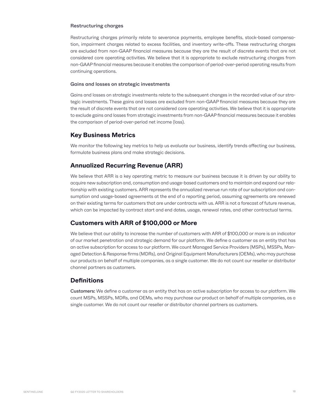 Q2 FY2025 Letter to SharehoLderSSENTINELONE 18 Restructuring charges Restructuring charges primarily relate to severance payments, employee benefits, stock-based compensa- tion, impairment charges related to excess facilities, and inventory write-offs. These restructuring charges are excluded from non-GAAP financial measures because they are the result of discrete events that are not considered core operating activities. We believe that it is appropriate to exclude restructuring charges from non-GAAP financial measures because it enables the comparison of period-over-period operating results from continuing operations. Gains and losses on strategic investments Gains and losses on strategic investments relate to the subsequent changes in the recorded value of our stra- tegic investments. These gains and losses are excluded from non-GAAP financial measures because they are the result of discrete events that are not considered core operating activities. We believe that it is appropriate to exclude gains and losses from strategic investments from non-GAAP financial measures because it enables the comparison of period-over-period net income (loss). Key Business Metrics We monitor the following key metrics to help us evaluate our business, identify trends affecting our business, formulate business plans and make strategic decisions. Annualized Recurring Revenue (ARR) We believe that ARR is a key operating metric to measure our business because it is driven by our ability to acquire new subscription and, consumption and usage-based customers and to maintain and expand our rela- tionship with existing customers. ARR represents the annualized revenue run rate of our subscription and con- sumption and usage-based agreements at the end of a reporting period, assuming agreements are renewed on their existing terms for customers that are under contracts with us. ARR is not a forecast of future revenue, which can be impacted by contract start and end dates, usage, renewal rates, and other contractual terms. Customers with ARR of $100,000 or More We believe that our ability to increase the number of customers with ARR of $100,000 or more is an indicator of our market penetration and strategic demand for our platform. We define a customer as an entity that has an active subscription for access to our platform. We count Managed Service Providers (MSPs), MSSPs, Man- aged Detection & Response firms (MDRs), and Original Equipment Manufacturers (OEMs), who may purchase our products on behalf of multiple companies, as a single customer. We do not count our reseller or distributor channel partners as customers. Definitions Customers: We define a customer as an entity that has an active subscription for access to our platform. We count MSPs, MSSPs, MDRs, and OEMs, who may purchase our product on behalf of multiple companies, as a single customer. We do not count our reseller or distributor channel partners as customers.