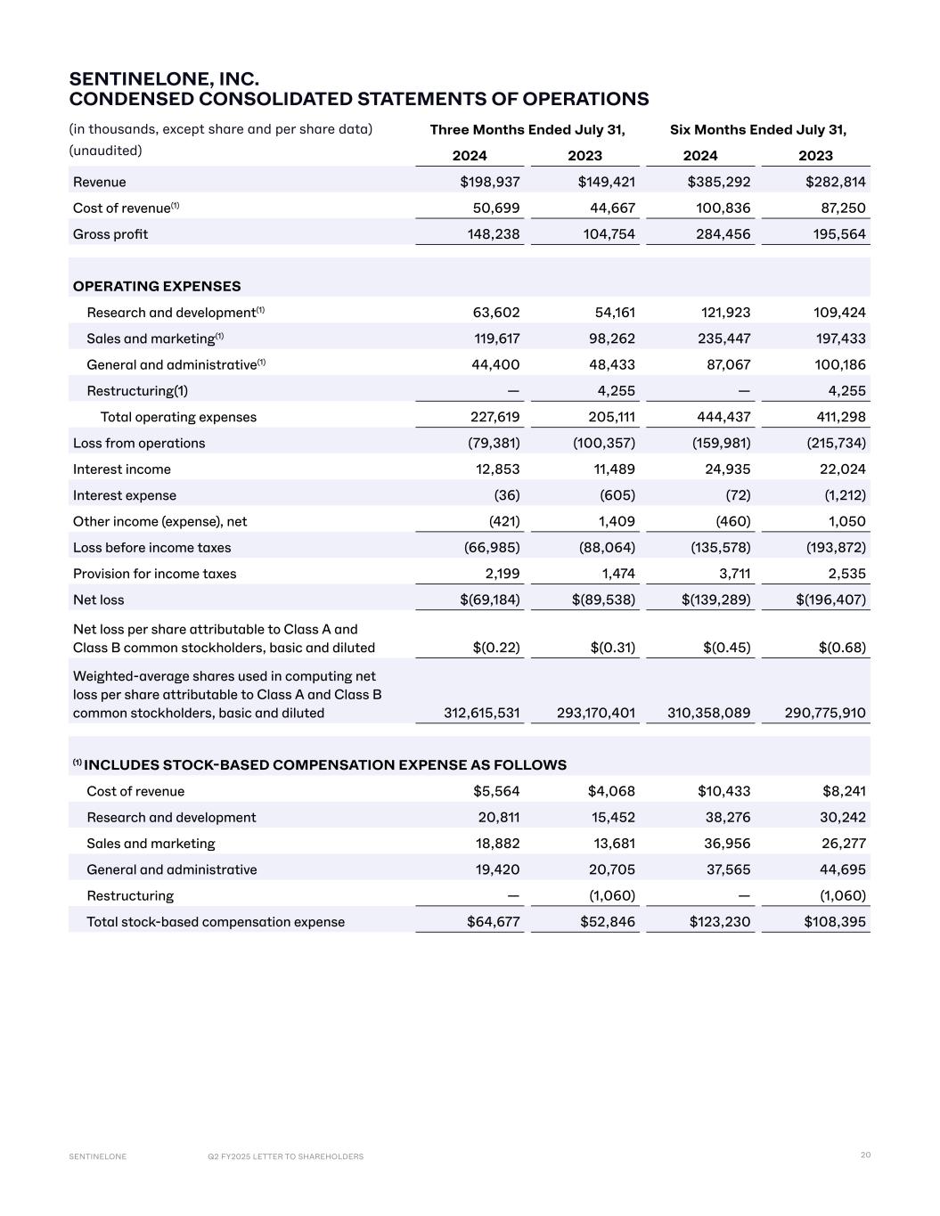 Q2 FY2025 Letter to SharehoLderSSENTINELONE 20 Three Months Ended July 31, Six Months Ended July 31, 2024 2023 2024 2023 Revenue $198,937 $149,421 $385,292 $282,814 Cost of revenue(1) 50,699 44,667 100,836 87,250 Gross profit 148,238 104,754 284,456 195,564 OPERATING EXPENSES Research and development(1) 63,602 54,161 121,923 109,424 Sales and marketing(1) 119,617 98,262 235,447 197,433 General and administrative(1) 44,400 48,433 87,067 100,186 Restructuring(1) — 4,255 — 4,255 Total operating expenses 227,619 205,111 444,437 411,298 Loss from operations (79,381) (100,357) (159,981) (215,734) Interest income 12,853 11,489 24,935 22,024 Interest expense (36) (605) (72) (1,212) Other income (expense), net (421) 1,409 (460) 1,050 Loss before income taxes (66,985) (88,064) (135,578) (193,872) Provision for income taxes 2,199 1,474 3,711 2,535 Net loss $(69,184) $(89,538) $(139,289) $(196,407) Net loss per share attributable to Class A and Class B common stockholders, basic and diluted $(0.22) $(0.31) $(0.45) $(0.68) Weighted-average shares used in computing net loss per share attributable to Class A and Class B common stockholders, basic and diluted 312,615,531 293,170,401 310,358,089 290,775,910 (1) INCLUDES STOCK-BASED COMPENSATION EXPENSE AS FOLLOWS Cost of revenue $5,564 $4,068 $10,433 $8,241 Research and development 20,811 15,452 38,276 30,242 Sales and marketing 18,882 13,681 36,956 26,277 General and administrative 19,420 20,705 37,565 44,695 Restructuring — (1,060) — (1,060) Total stock-based compensation expense $64,677 $52,846 $123,230 $108,395 SENTINELONE, INC. CONDENSED CONSOLIDATED STATEMENTS OF OPERATIONS (in thousands, except share and per share data) (unaudited)