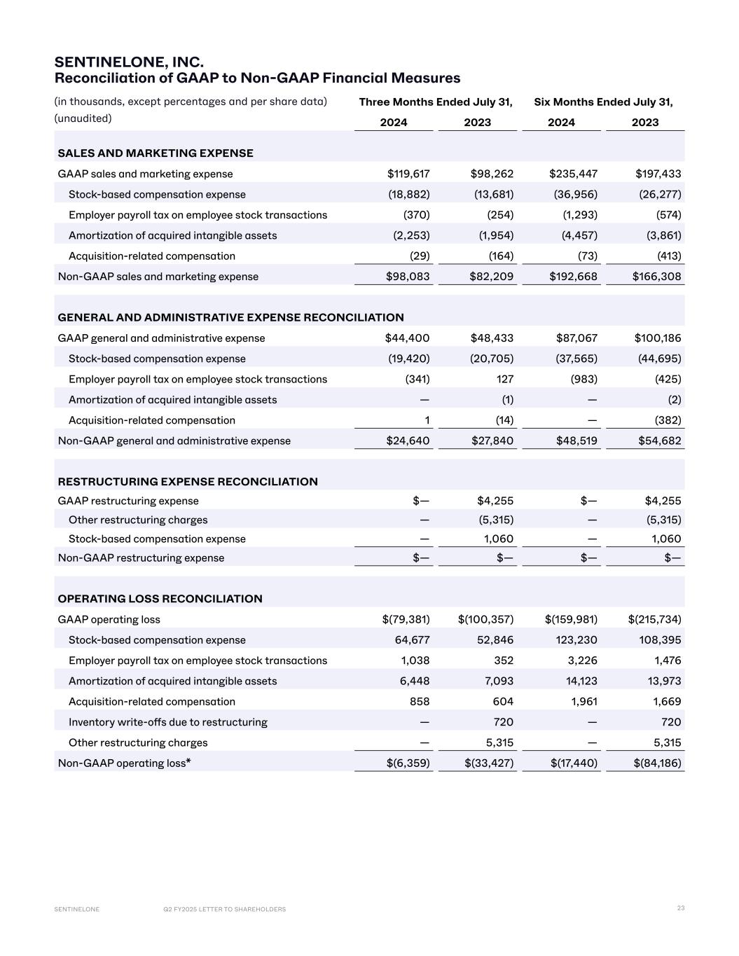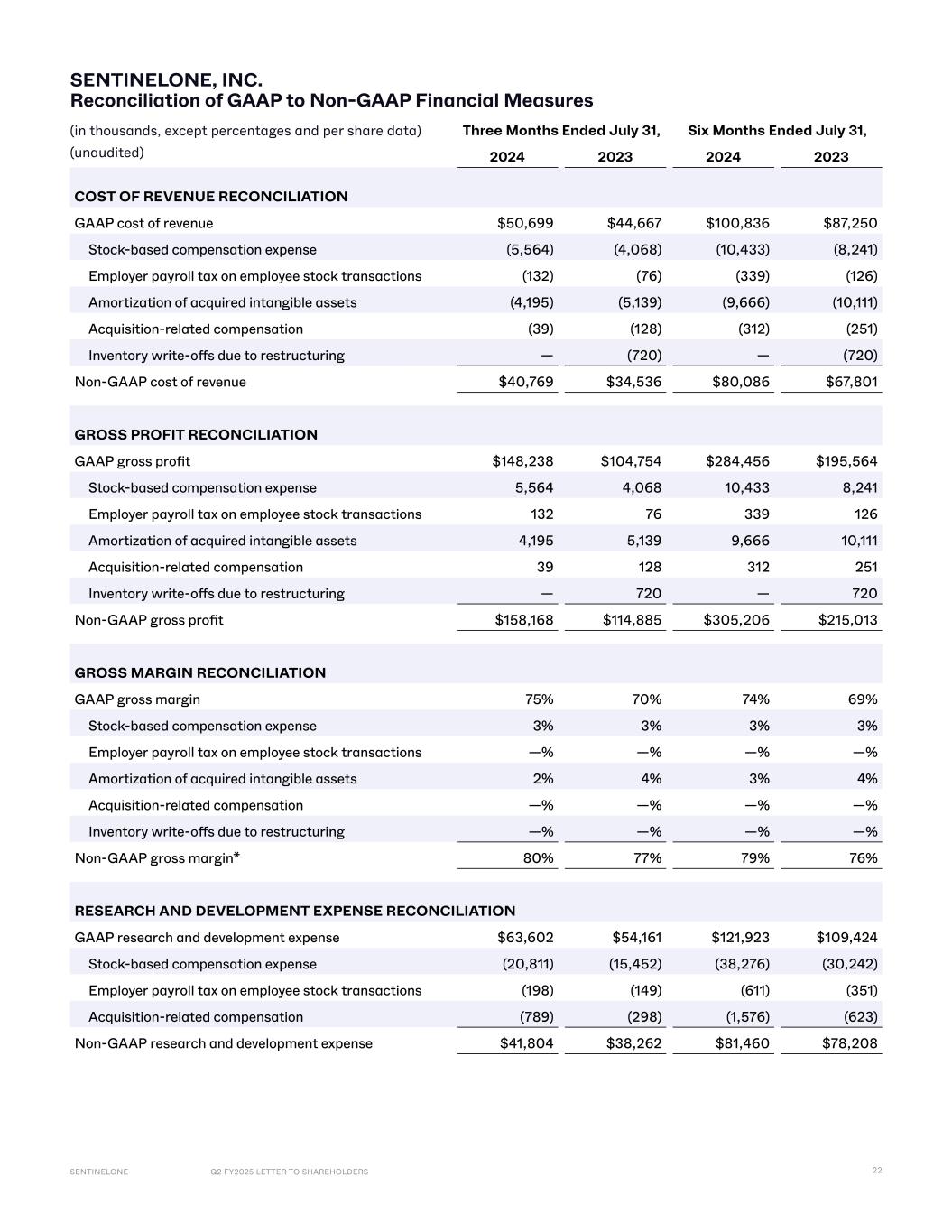 Q2 FY2025 Letter to SharehoLderSSENTINELONE 22 Three Months Ended July 31, Six Months Ended July 31, 2024 2023 2024 2023 COST OF REVENUE RECONCILIATION GAAP cost of revenue $50,699 $44,667 $100,836 $87,250 Stock-based compensation expense (5,564) (4,068) (10,433) (8,241) Employer payroll tax on employee stock transactions (132) (76) (339) (126) Amortization of acquired intangible assets (4,195) (5,139) (9,666) (10,111) Acquisition-related compensation (39) (128) (312) (251) Inventory write-offs due to restructuring — (720) — (720) Non-GAAP cost of revenue $40,769 $34,536 $80,086 $67,801 GROSS PROFIT RECONCILIATION GAAP gross profit $148,238 $104,754 $284,456 $195,564 Stock-based compensation expense 5,564 4,068 10,433 8,241 Employer payroll tax on employee stock transactions 132 76 339 126 Amortization of acquired intangible assets 4,195 5,139 9,666 10,111 Acquisition-related compensation 39 128 312 251 Inventory write-offs due to restructuring — 720 — 720 Non-GAAP gross profit $158,168 $114,885 $305,206 $215,013 GROSS MARGIN RECONCILIATION GAAP gross margin 75% 70% 74% 69% Stock-based compensation expense 3% 3% 3% 3% Employer payroll tax on employee stock transactions —% —% —% —% Amortization of acquired intangible assets 2% 4% 3% 4% Acquisition-related compensation —% —% —% —% Inventory write-offs due to restructuring —% —% —% —% Non-GAAP gross margin* 80% 77% 79% 76% RESEARCH AND DEVELOPMENT EXPENSE RECONCILIATION GAAP research and development expense $63,602 $54,161 $121,923 $109,424 Stock-based compensation expense (20,811) (15,452) (38,276) (30,242) Employer payroll tax on employee stock transactions (198) (149) (611) (351) Acquisition-related compensation (789) (298) (1,576) (623) Non-GAAP research and development expense $41,804 $38,262 $81,460 $78,208 SENTINELONE, INC. Reconciliation of GAAP to Non-GAAP Financial Measures (in thousands, except percentages and per share data) (unaudited)