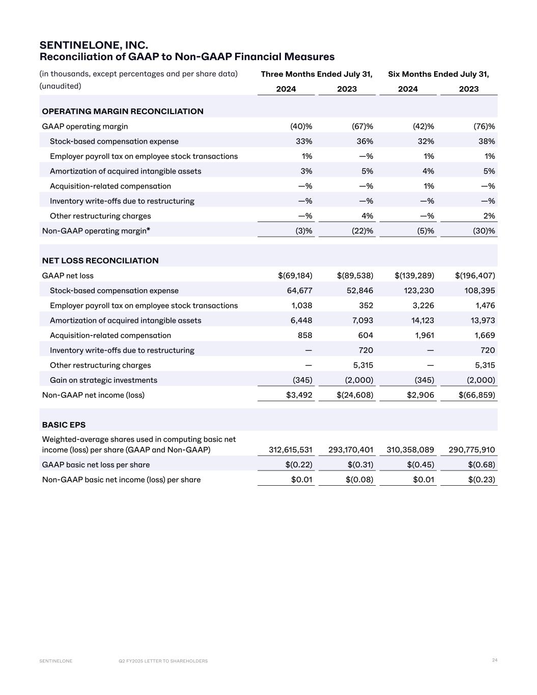 Q2 FY2025 Letter to SharehoLderSSENTINELONE 24 Three Months Ended July 31, Six Months Ended July 31, 2024 2023 2024 2023 OPERATING MARGIN RECONCILIATION GAAP operating margin (40)% (67)% (42)% (76)% Stock-based compensation expense 33% 36% 32% 38% Employer payroll tax on employee stock transactions 1% —% 1% 1% Amortization of acquired intangible assets 3% 5% 4% 5% Acquisition-related compensation —% —% 1% —% Inventory write-offs due to restructuring —% —% —% —% Other restructuring charges —% 4% —% 2% Non-GAAP operating margin* (3)% (22)% (5)% (30)% NET LOSS RECONCILIATION GAAP net loss $(69,184) $(89,538) $(139,289) $(196,407) Stock-based compensation expense 64,677 52,846 123,230 108,395 Employer payroll tax on employee stock transactions 1,038 352 3,226 1,476 Amortization of acquired intangible assets 6,448 7,093 14,123 13,973 Acquisition-related compensation 858 604 1,961 1,669 Inventory write-offs due to restructuring — 720 — 720 Other restructuring charges — 5,315 — 5,315 Gain on strategic investments (345) (2,000) (345) (2,000) Non-GAAP net income (loss) $3,492 $(24,608) $2,906 $(66,859) BASIC EPS Weighted-average shares used in computing basic net income (loss) per share (GAAP and Non-GAAP) 312,615,531 293,170,401 310,358,089 290,775,910 GAAP basic net loss per share $(0.22) $(0.31) $(0.45) $(0.68) Non-GAAP basic net income (loss) per share $0.01 $(0.08) $0.01 $(0.23) SENTINELONE, INC. Reconciliation of GAAP to Non-GAAP Financial Measures (in thousands, except percentages and per share data) (unaudited)