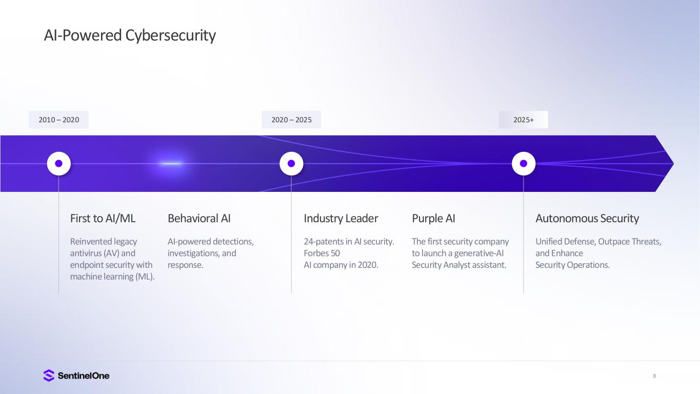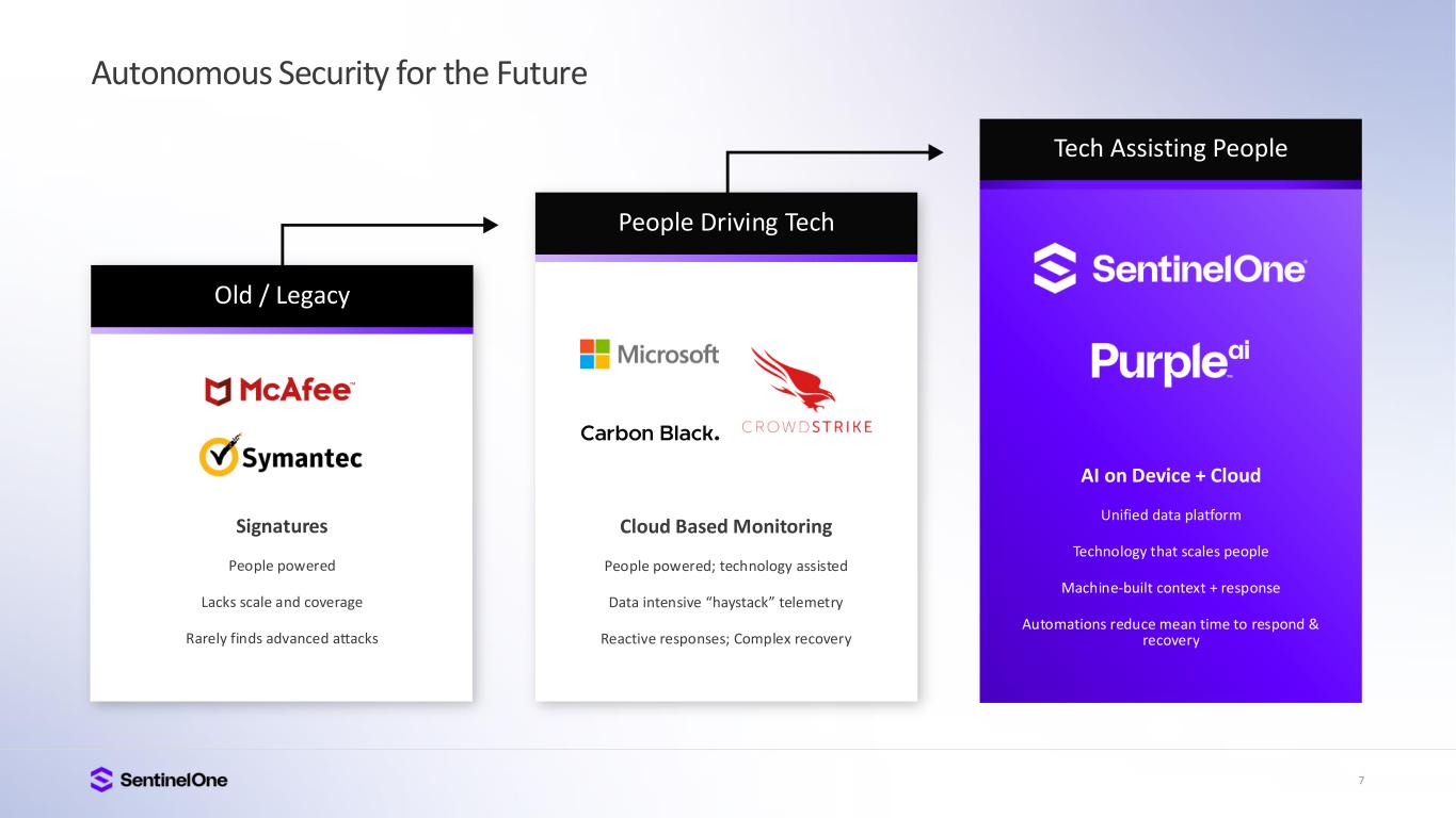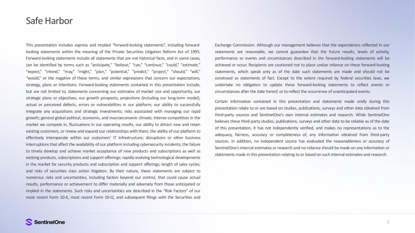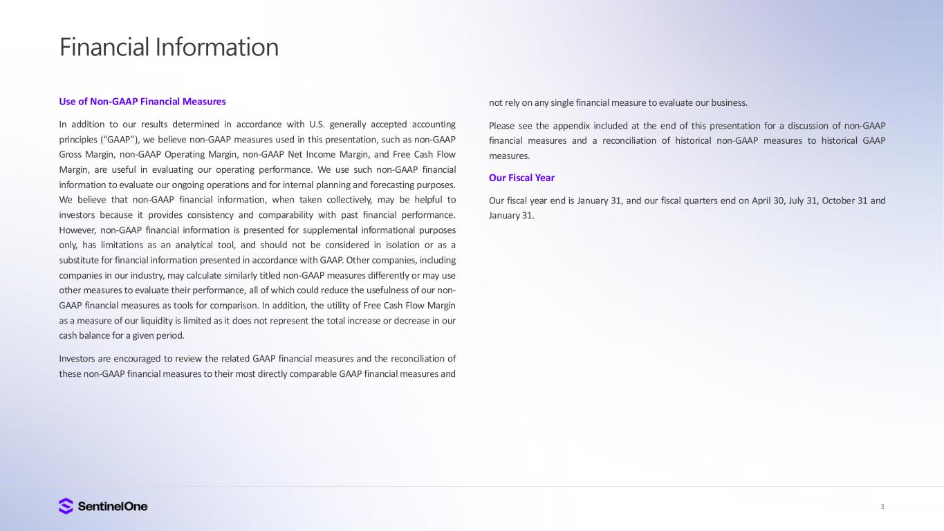 2 Safe Harbor This presentation includes express and implied “forward-looking statements”, including forward- looking statements within the meaning of the Private Securities Litigation Reform Act of 1995. Forward-looking statements include all statements that are not historical facts, and in some cases, can be identified by terms such as “anticipate,” “believe,” “can,” “continue,” “could,” “estimate,” “expect,” “intend,” “may,” “might,” “plan,” “potential,” “predict,” “project,” “should,” “will,” “would,” or the negative of these terms, and similar expressions that concern our expectations, strategy, plans or intentions. Forward-looking statements contained in this presentation include, but are not limited to, statements concerning our estimates of market size and opportunity, our strategic plans or objectives, our growth prospects, projections (including our long-term model), actual or perceived defects, errors or vulnerabilities in our platform; our ability to successfully integrate any acquisitions and strategic investments; risks associated with managing our rapid growth; general global political, economic, and macroeconomic climate, intense competition in the market we compete in, fluctuations in our operating results, our ability to attract new and retain existing customers, or renew and expand our relationships with them; the ability of our platform to effectively interoperate within our customers’ IT infrastructure; disruptions or other business interruptions that affect the availability of our platform including cybersecurity incidents; the failure to timely develop and achieve market acceptance of new products and subscriptions as well as existing products, subscriptions and support offerings; rapidly evolving technological developments in the market for security products and subscription and support offerings; length of sales cycles; and risks of securities class action litigation. By their nature, these statements are subject to numerous risks and uncertainties, including factors beyond our control, that could cause actual results, performance or achievement to differ materially and adversely from those anticipated or implied in the statements. Such risks and uncertainties are described in the “Risk Factors” of our most recent Form 10-K, most recent Form 10-Q, and subsequent filings with the Securities and Exchange Commission. Although our management believes that the expectations reflected in our statements are reasonable, we cannot guarantee that the future results, levels of activity, performance or events and circumstances described in the forward-looking statements will be achieved or occur. Recipients are cautioned not to place undue reliance on these forward-looking statements, which speak only as of the date such statements are made and should not be construed as statements of fact. Except to the extent required by federal securities laws, we undertake no obligation to update these forward-looking statements to reflect events or circumstances after the date hereof, or to reflect the occurrence of unanticipated events. Certain information contained in this presentation and statements made orally during this presentation relate to or are based on studies, publications, surveys and other data obtained from third-party sources and SentinelOne’s own internal estimates and research. While SentinelOne believes these third-party studies, publications, surveys and other data to be reliable as of the date of this presentation, it has not independently verified, and makes no representations as to the adequacy, fairness, accuracy or completeness of, any information obtained from third-party sources. In addition, no independent source has evaluated the reasonableness or accuracy of SentinelOne’s internal estimates or research and no reliance should be made on any information or statements made in this presentation relating to or based on such internal estimates and research.