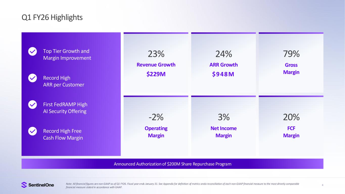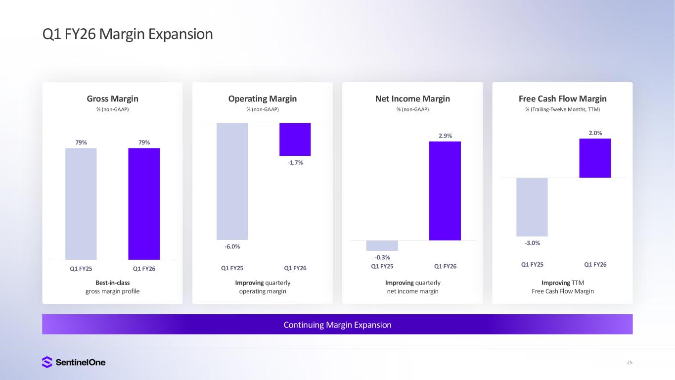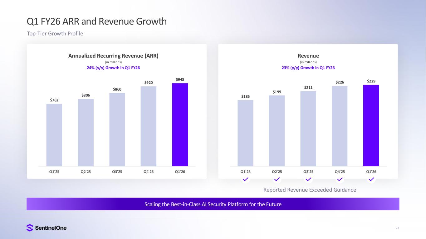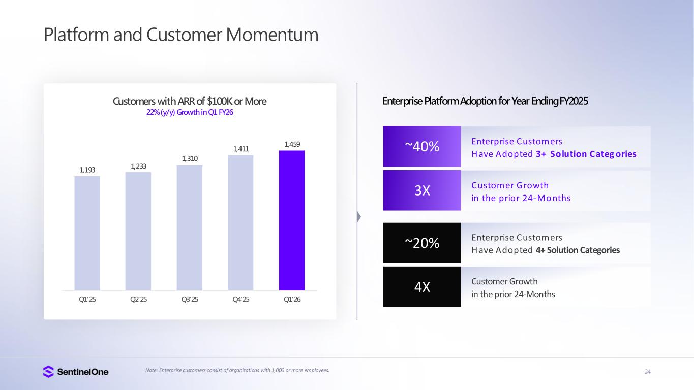 23 $186 $199 $211 $226 $229 $- $50 $10 $150 $20 $250 Q1'25 Q2'25 Q3'25 Q4'25 Q1'26 $762 $806 $860 $920 $948 $20 $30 $40 $50 $60 $70 $80 $90 $1,00 Q1'25 Q2'25 Q3'25 Q4'25 Q1'26 Q1 FY26 ARR and Revenue Growth Annualized Recurring Revenue (ARR) (in millions) 24% (y/y) Growth in Q1 FY26 Revenue (in millions) 23% (y/y) Growth in Q1 FY26 Scaling the Best-in-Class AI Security Platform for the Future Top-Tier Growth Profile Reported Revenue Exceeded Guidance