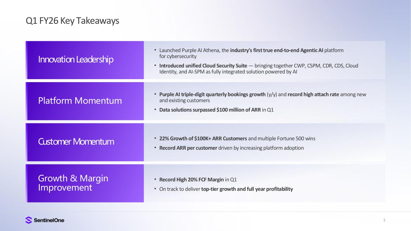 4 Q1 FY26 Highlights Note: All financial figures are non-GAAP as of Q1 FY26. Fiscal year ends January 31. See Appendix for definition of metrics and a reconciliation of each non-GAAP financial measure to the most directly comparable financial measure stated in accordance with GAAP. 23% Revenue Growth $229M 24% ARR Growth $948M 79% Gross Margin -2% Operating Margin 3% Net Income Margin 20% FCF Margin Top Tier Growth and Margin Improvement Record High ARR per Customer First FedRAMP High AI Security Offering Record High Free Cash Flow Margin Announced Authorization of $200M Share Repurchase Program