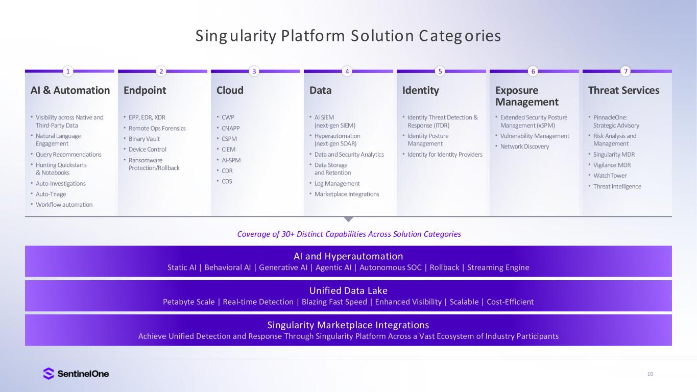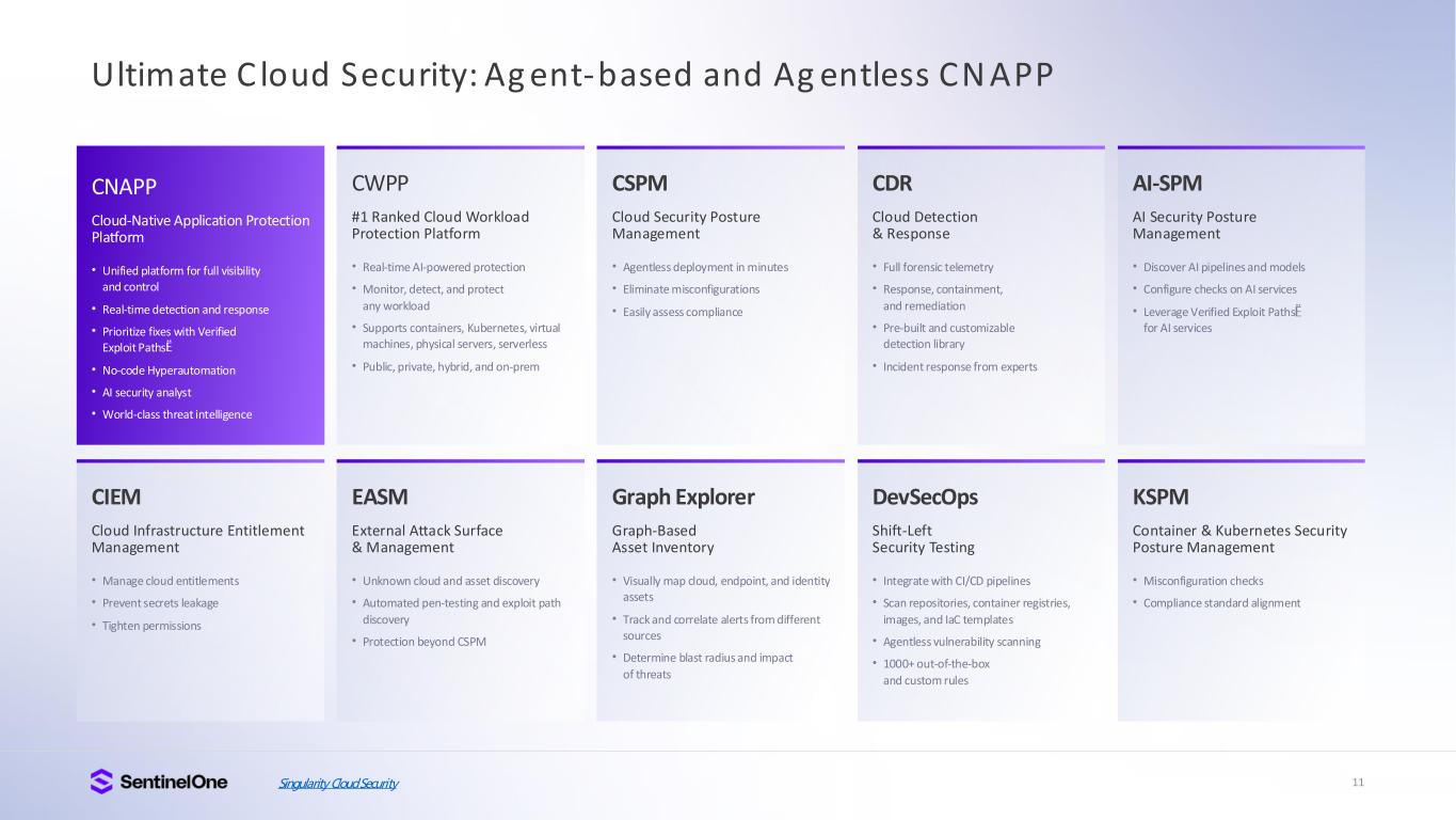 10 Sing ularity Platform Solution Categ ories AI & Automation • EPP, EDR, XDR • Remote Ops Forensics • Binary Vault • Device Control • Ransomware Protection/Rollback Endpoint • CWP • CNAPP • CSPM • CIEM • AI-SPM • CDR • CDS Cloud • AI SIEM (next-gen SIEM) • Hyperautomation (next-gen SOAR) • Data and Security Analytics • Data Storage and Retention • Log Management • Marketplace Integrations Data • Identity Threat Detection & Response (ITDR) • Identity Posture Management • Identity for Identity Providers Identity • Extended Security Posture Management (xSPM) • Vulnerability Management • Network Discovery Exposure Management • PinnacleOne: Strategic Advisory • Risk Analysis and Management • Singularity MDR • Vigilance MDR • WatchTower • Threat Intelligence Threat Services AI and Hyperautomation Coverage of 30+ Distinct Capabilities Across Solution Categories Unified Data Lake Singularity Marketplace Integrations • Visibility across Native and Third-Party Data • Natural Language Engagement • Query Recommendations • Hunting Quickstarts & Notebooks • Auto-Investigations • Auto-Triage • Workflow automation 1 2 3 4 5 6 7