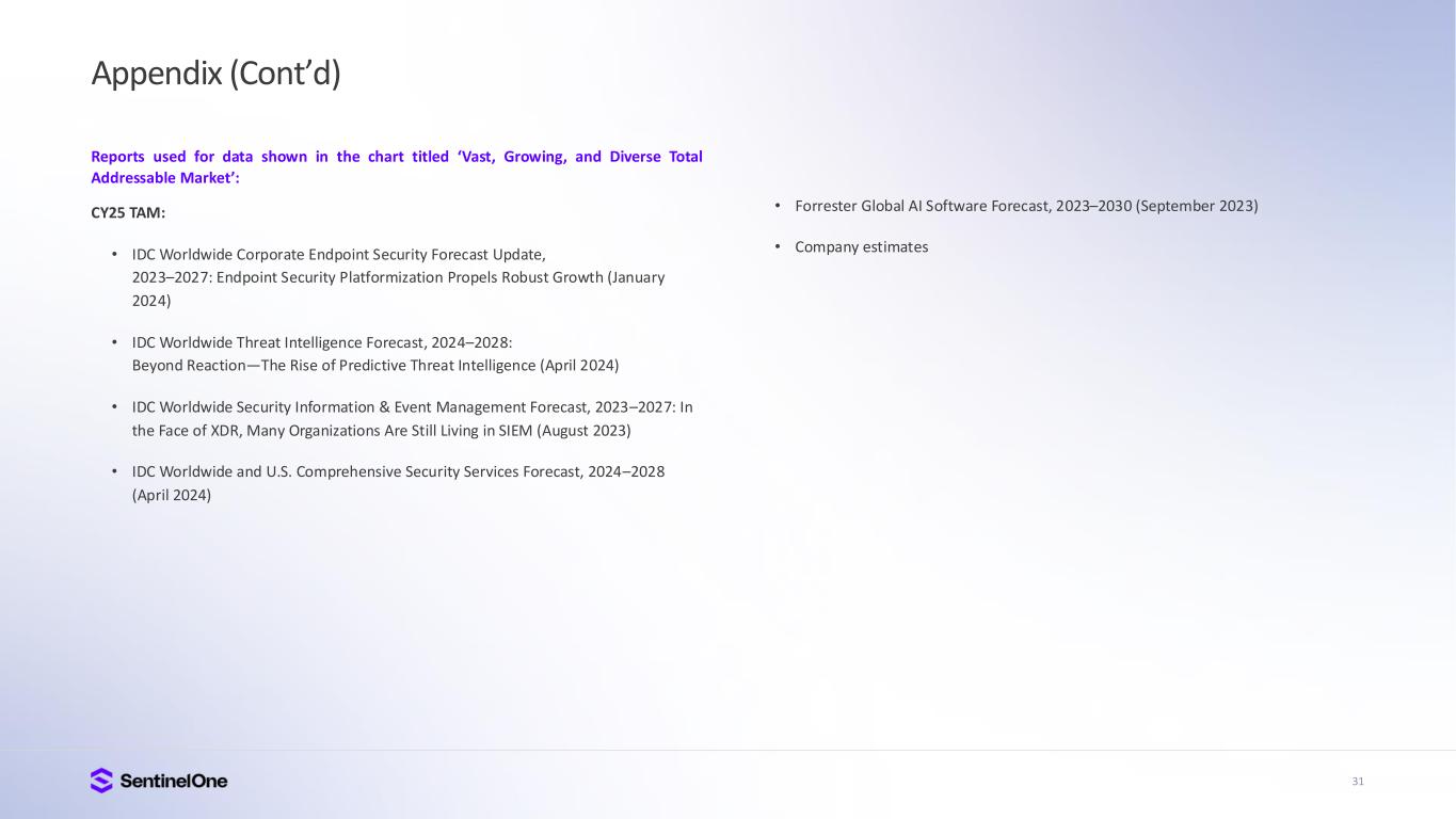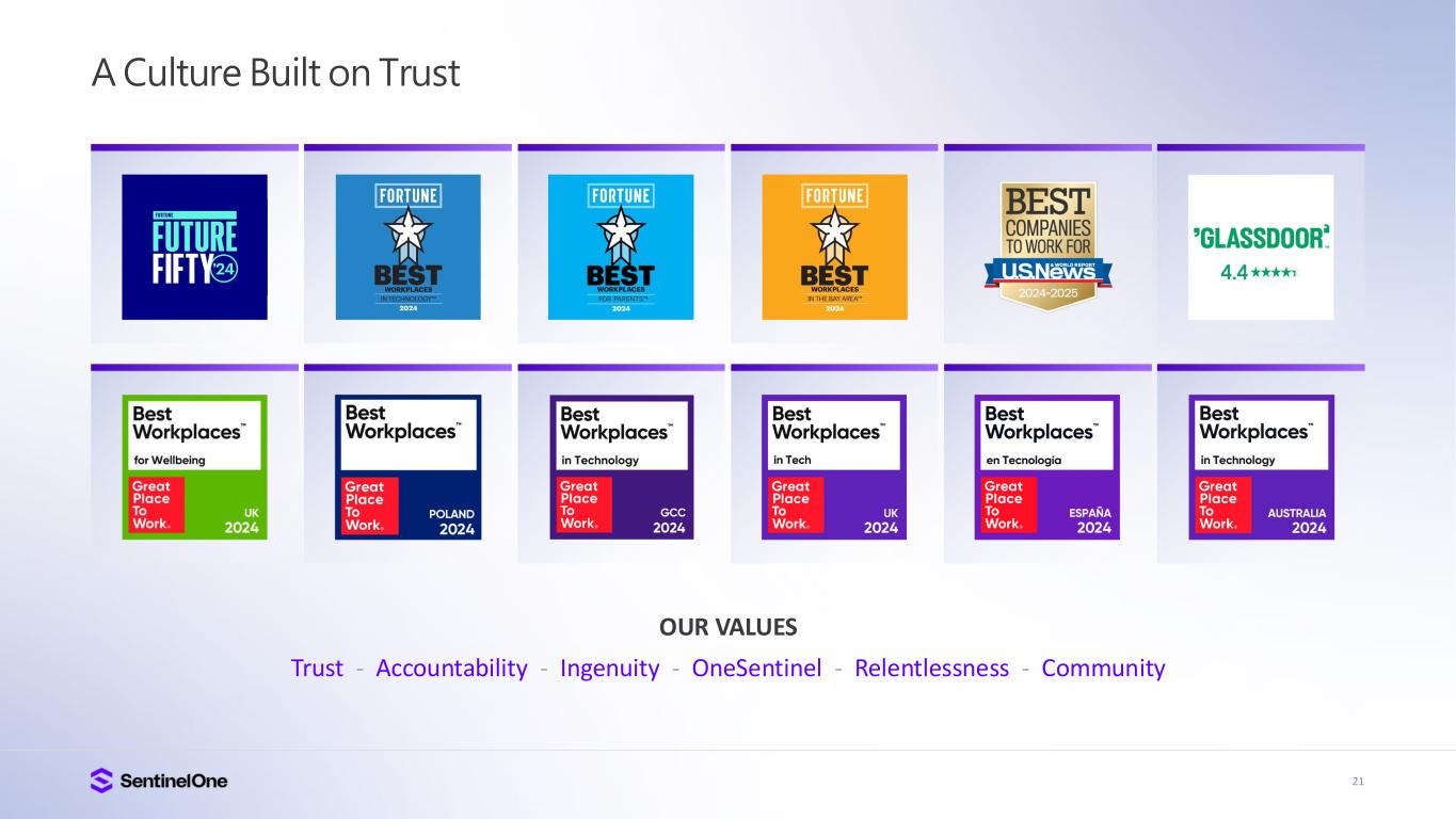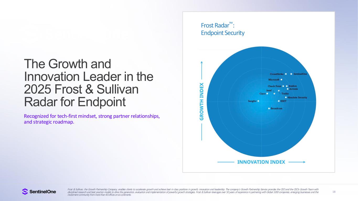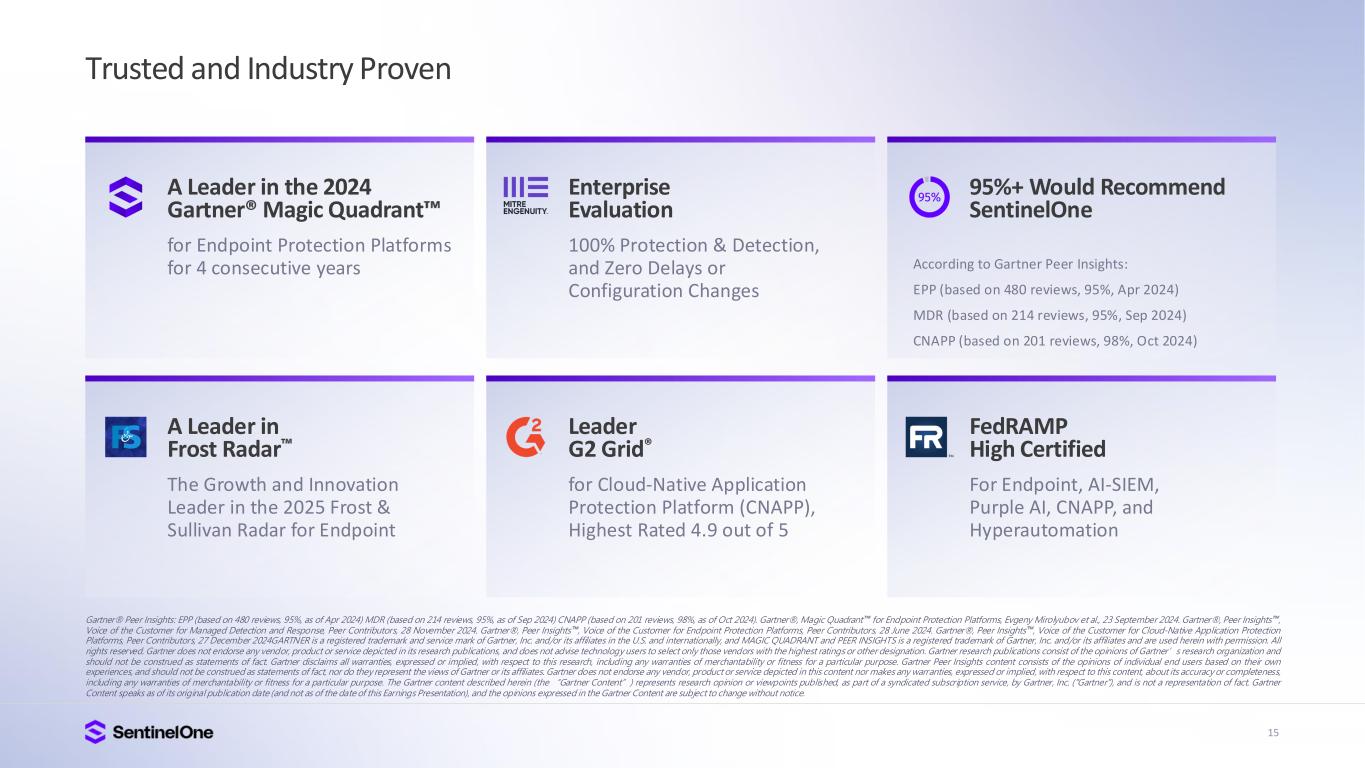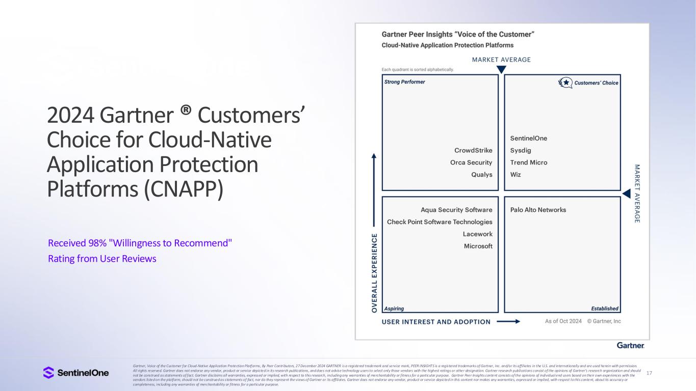 15 Trusted and Industry Proven Gartner® Peer Insights: EPP (based on 480 reviews, 95%, as of Apr 2024) MDR (based on 214 reviews, 95%, as of Sep 2024) CNAPP (based on 201 reviews, 98%, as of Oct 2024). Gartner®, Magic Quadrant for Endpoint Protection Platforms, Evgeny Mirolyubov et al., 23 September 2024. Gartner®, Peer Insights , Voice of the Customer for Managed Detection and Response, Peer Contributors, 28 November 2024. Gartner®, Peer Insights , Voice of the Customer for Endpoint Protection Platforms, Peer Contributors, 28 June 2024. Gartner®, Peer Insights , Voice of the Customer for Cloud-Native Application Protection Platforms, Peer Contributors, 27 December 2024GARTNER is a registered trademark and service mark of Gartner, Inc. and/or its affiliates in the U.S. and internationally, and MAGIC QUADRANT and PEER INSIGHTS is a registered trademark of Gartner, Inc. and/or its affiliates and are used herein with permission. All rights reserved. Gartner does not endorse any vendor, product or service depicted in its research publications, and does not advise technology users to select only those vendors with the highest ratings or other designation. Gartner research publications consist of the opinions of Gartner’s research organization and should not be construed as statements of fact. Gartner disclaims all warranties, expressed or implied, with respect to this research, including any warranties of merchantability or fitness for a particular purpose. Gartner Peer Insights content consists of the opinions of individual end users based on their own experiences, and should not be construed as statements of fact, nor do they represent the views of Gartner or its affiliates. Gartner does not endorse any vendor, product or service depicted in this content nor makes any warranties, expressed or implied, with respect to this content, about its accuracy or completeness, including any warranties of merchantability or fitness for a particular purpose. The Gartner content described herein (the “Gartner Content”) represents research opinion or viewpoints published, as part of a syndicated subscription service, by Gartner, Inc. ("Gartner"), and is not a representation of fact. Gartner Content speaks as of its original publication date (and not as of the date of this Earnings Presentation), and the opinions expressed in the Gartner Content are subject to change without notice. A Leader in Frost Radar The Growth and Innovation Leader in the 2025 Frost & Sullivan Radar for Endpoint Leader G2 Grid® for Cloud-Native Application Protection Platform (CNAPP), Highest Rated 4.9 out of 5 FedRAMP High Certified For Endpoint, AI-SIEM, Purple AI, CNAPP, and Hyperautomation A Leader in the 2024 Gartner® Magic Quadrant for Endpoint Protection Platforms for 4 consecutive years Enterprise Evaluation 100% Protection & Detection, and Zero Delays or Configuration Changes 95%+ Would Recommend SentinelOne According to Gartner Peer Insights: EPP (based on 480 reviews, 95%, Apr 2024) MDR (based on 214 reviews, 95%, Sep 2024) CNAPP (based on 201 reviews, 98%, Oct 2024)