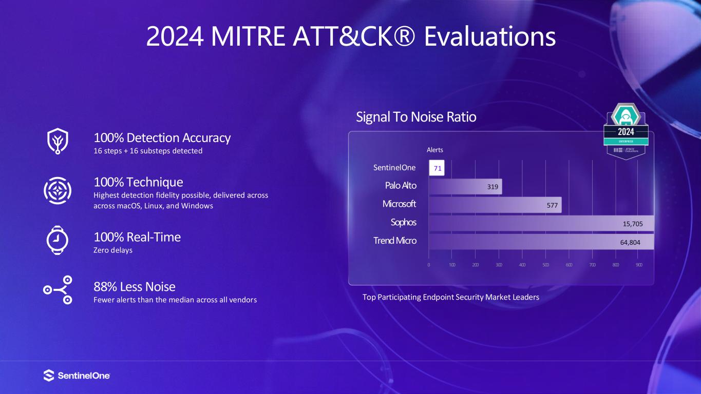 16 Top Participating Endpoint Security Market Leaders Signal To Noise Ratio Alerts SentinelOne Palo Alto Microsoft Sophos Trend Micro 0 100 200 300 400 500 600 700 800 900 71 319 577 15,705 64,804 100% Detection Accuracy 16 steps + 16 substeps detected 100% Technique Highest detection fidelity possible, delivered across across macOS, Linux, and Windows 100% Real-Time Zero delays 88% Less Noise Fewer alerts than the median across all vendors 2024 MITRE ATT&CK® Evaluations