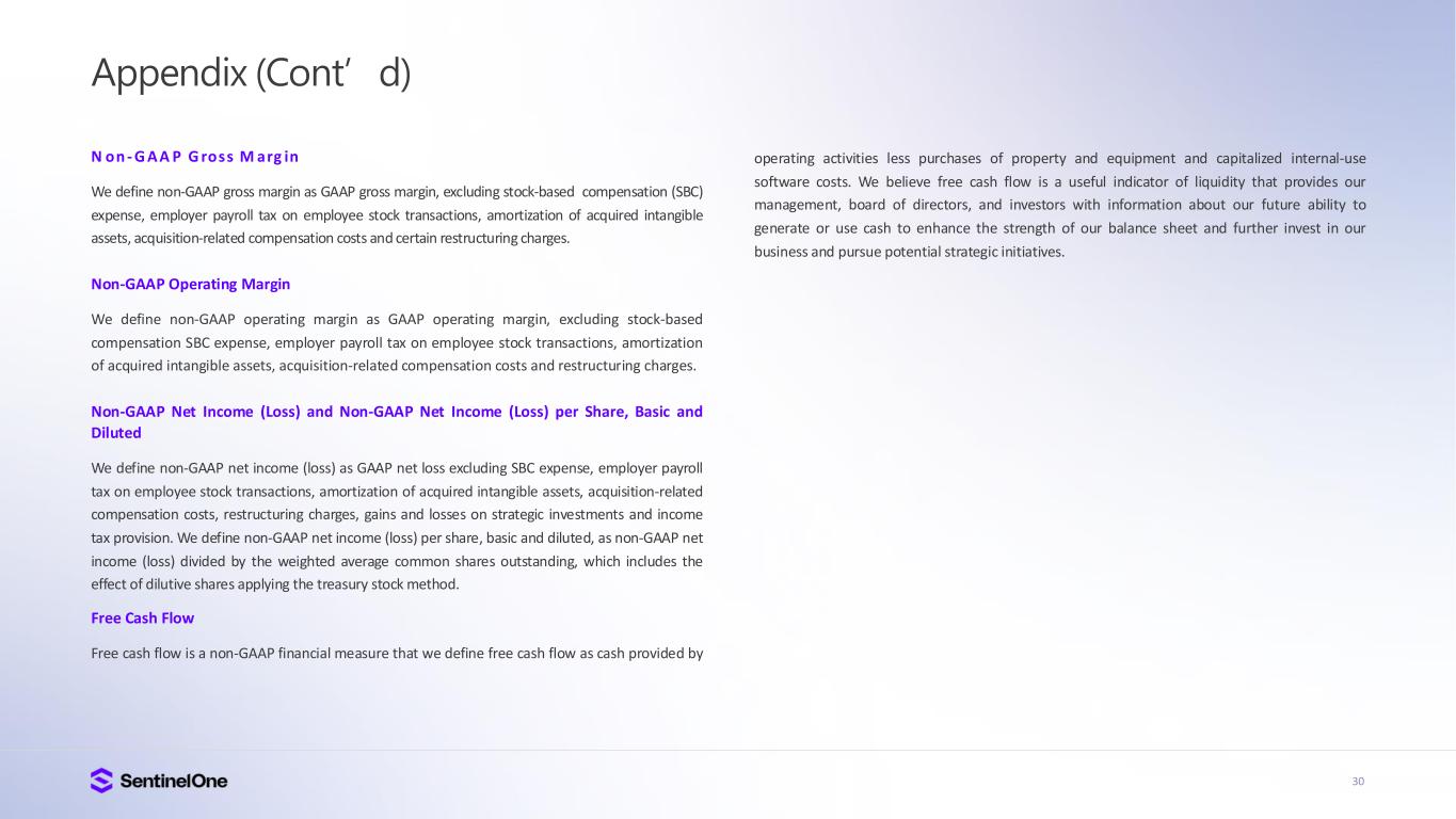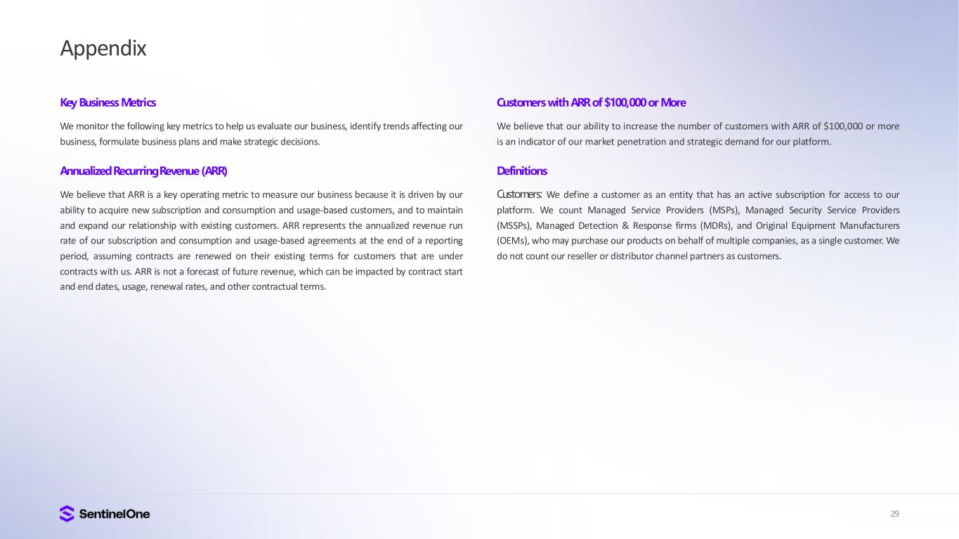 29 Appendix Key Business Metrics We monitor the following key metrics to help us evaluate our business, identify trends affecting our business, formulate business plans and make strategic decisions. Annualized Recurring Revenue (ARR) We believe that ARR is a key operating metric to measure our business because it is driven by our ability to acquire new subscription and consumption and usage-based customers, and to maintain and expand our relationship with existing customers. ARR represents the annualized revenue run rate of our subscription and consumption and usage-based agreements at the end of a reporting period, assuming contracts are renewed on their existing terms for customers that are under contracts with us. ARR is not a forecast of future revenue, which can be impacted by contract start and end dates, usage, renewal rates, and other contractual terms. Customers with ARR of $100,000 or More We believe that our ability to increase the number of customers with ARR of $100,000 or more is an indicator of our market penetration and strategic demand for our platform. Definitions Customers: We define a customer as an entity that has an active subscription for access to our platform. We count Managed Service Providers (MSPs), Managed Security Service Providers (MSSPs), Managed Detection & Response firms (MDRs), and Original Equipment Manufacturers (OEMs), who may purchase our products on behalf of multiple companies, as a single customer. We do not count our reseller or distributor channel partners as customers.