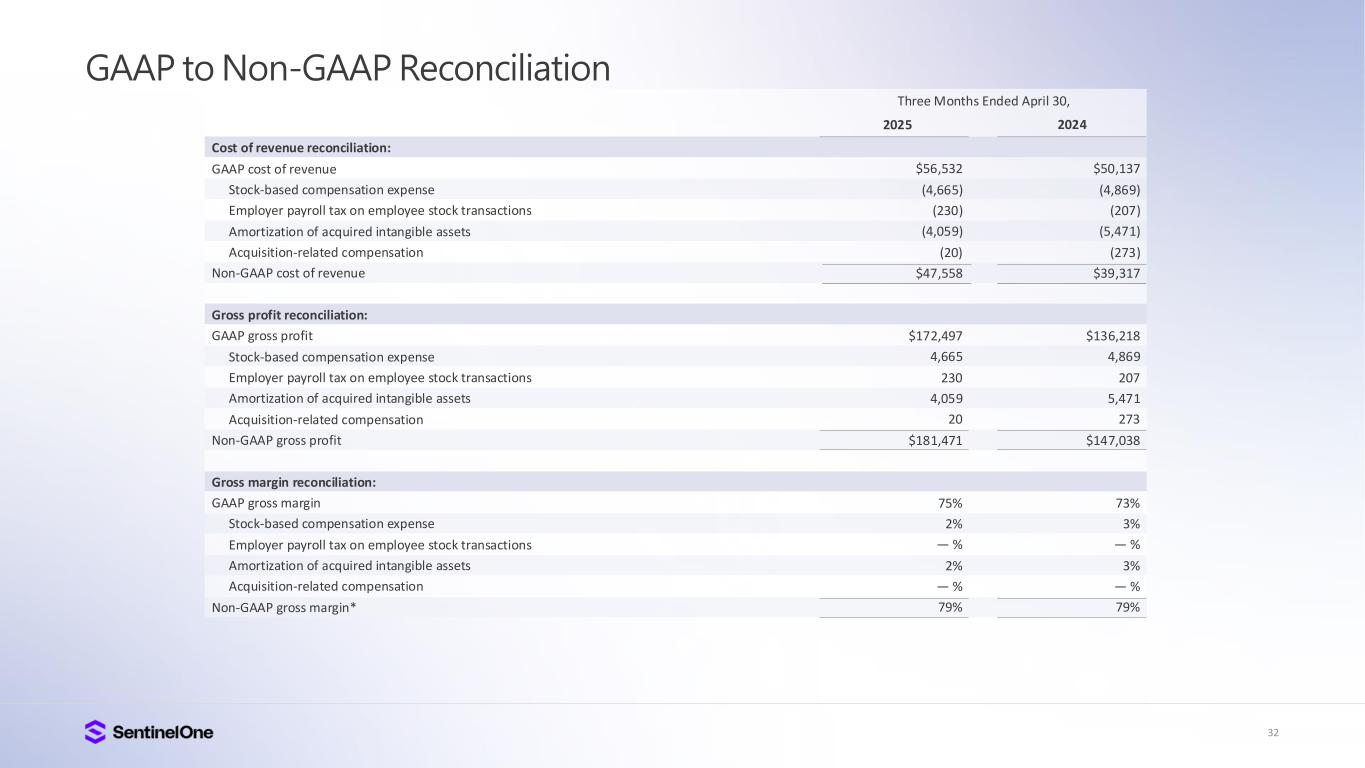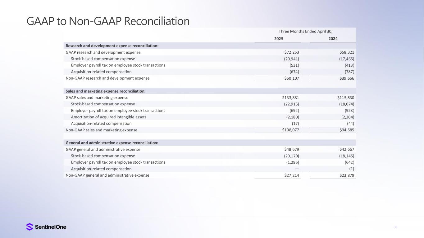 32 GAAP to Non-GAAP Reconciliation Cost of revenue reconciliation: GAAP cost of revenue Stock-based compensation expense Employer payroll tax on employee stock transactions Amortization of acquired intangible assets Acquisition-related compensation Non-GAAP cost of revenue Gross profit reconciliation: GAAP gross profit Stock-based compensation expense Employer payroll tax on employee stock transactions Amortization of acquired intangible assets Acquisition-related compensation Non-GAAP gross profit Gross margin reconciliation: GAAP gross margin Stock-based compensation expense Employer payroll tax on employee stock transactions Amortization of acquired intangible assets Acquisition-related compensation Non-GAAP gross margin* Three Months Ended April 30, 2025 $56,532 (4,665) (230) (4,059) (20) $47,558 $172,497 4,665 230 4,059 20 $181,471 75% 2% — % 2% — % 79% 2024 $50,137 (4,869) (207) (5,471) (273) $39,317 $136,218 4,869 207 5,471 273 $147,038 73% 3% — % 3% — % 79%