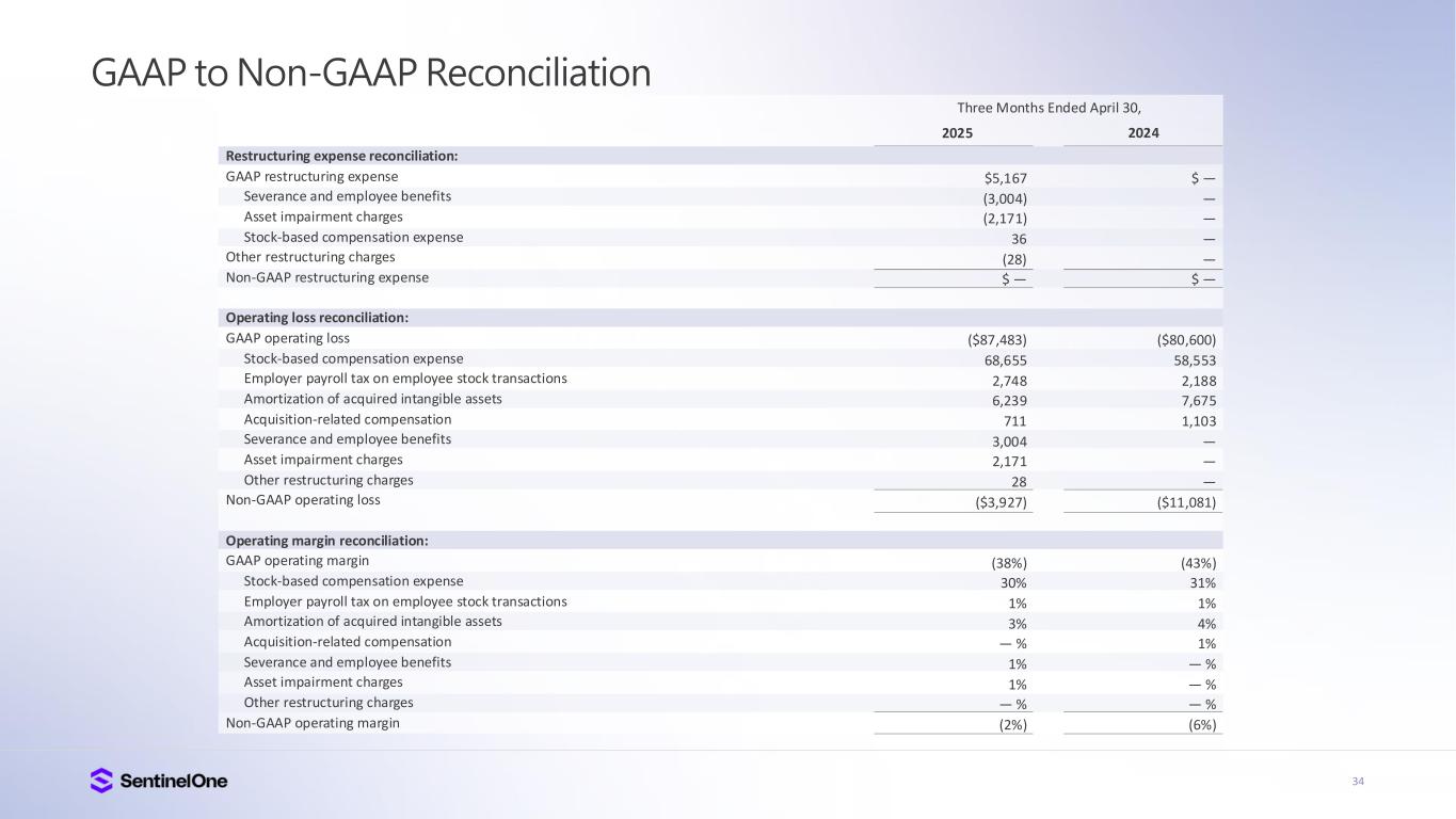 33 GAAP to Non-GAAP Reconciliation Research and development expense reconciliation: GAAP research and development expense Stock-based compensation expense Employer payroll tax on employee stock transactions Acquisition-related compensation Non-GAAP research and development expense Sales and marketing expense reconciliation: GAAP sales and marketing expense Stock-based compensation expense Employer payroll tax on employee stock transactions Amortization of acquired intangible assets Acquisition-related compensation Non-GAAP sales and marketing expense General and administrative expense reconciliation: GAAP general and administrative expense Stock-based compensation expense Employer payroll tax on employee stock transactions Acquisition-related compensation Non-GAAP general and administrative expense $72,253 (20,941) (531) (674) $50,107 $133,881 (22,915) (692) (2,180) (17) $108,077 $48,679 (20,170) (1,295) — $27,214 $58,321 (17,465) (413) (787) $39,656 $115,830 (18,074) (923) (2,204) (44) $94,585 $42,667 (18,145) (642) (1) $23,879 Three Months Ended April 30, 2025 2024