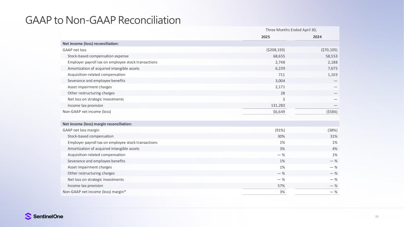 34 GAAP to Non-GAAP Reconciliation Restructuring expense reconciliation: GAAP restructuring expense Severance and employee benefits Asset impairment charges Stock-based compensation expense Other restructuring charges Non-GAAP restructuring expense Operating loss reconciliation: GAAP operating loss Stock-based compensation expense Employer payroll tax on employee stock transactions Amortization of acquired intangible assets Acquisition-related compensation Severance and employee benefits Asset impairment charges Other restructuring charges Non-GAAP operating loss Operating margin reconciliation: GAAP operating margin Stock-based compensation expense Employer payroll tax on employee stock transactions Amortization of acquired intangible assets Acquisition-related compensation Severance and employee benefits Asset impairment charges Other restructuring charges Non-GAAP operating margin $5,167 (3,004) (2,171) 36 (28) $ — ($87,483) 68,655 2,748 6,239 711 3,004 2,171 28 ($3,927) (38%) 30% 1% 3% — % 1% 1% — % (2%) $ — — — — — $ — ($80,600) 58,553 2,188 7,675 1,103 — — — ($11,081) (43%) 31% 1% 4% 1% — % — % — % (6%) Three Months Ended April 30, 2025 2024
