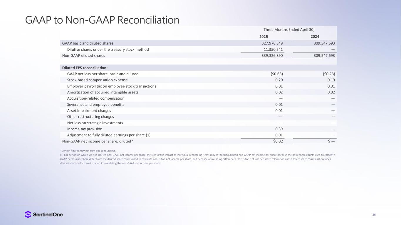 35 GAAP to Non-GAAP Reconciliation Net income (loss) reconciliation: GAAP net loss Stock-based compensation expense Employer payroll tax on employee stock transactions Amortization of acquired intangible assets Acquisition-related compensation Severance and employee benefits Asset impairment charges Other restructuring charges Net loss on strategic investments Income tax provision Non-GAAP net income (loss) Net income (loss) margin reconciliation: GAAP net loss margin Stock-based compensation Employer payroll tax on employee stock transactions Amortization of acquired intangible assets Acquisition-related compensation Severance and employee benefits Asset impairment charges Other restructuring charges Net loss on strategic investments Income tax provision Non-GAAP net income (loss) margin* ($208,193) 68,655 2,748 6,239 711 3,004 2,171 28 3 131,283 $6,649 (91%) 30% 1% 3% — % 1% 1% — % — % 57% 3% ($70,105) 58,553 2,188 7,675 1,103 — — — — — ($586) (38%) 31% 1% 4% 1% — % — % — % — % — % — % Three Months Ended April 30, 2025 2024