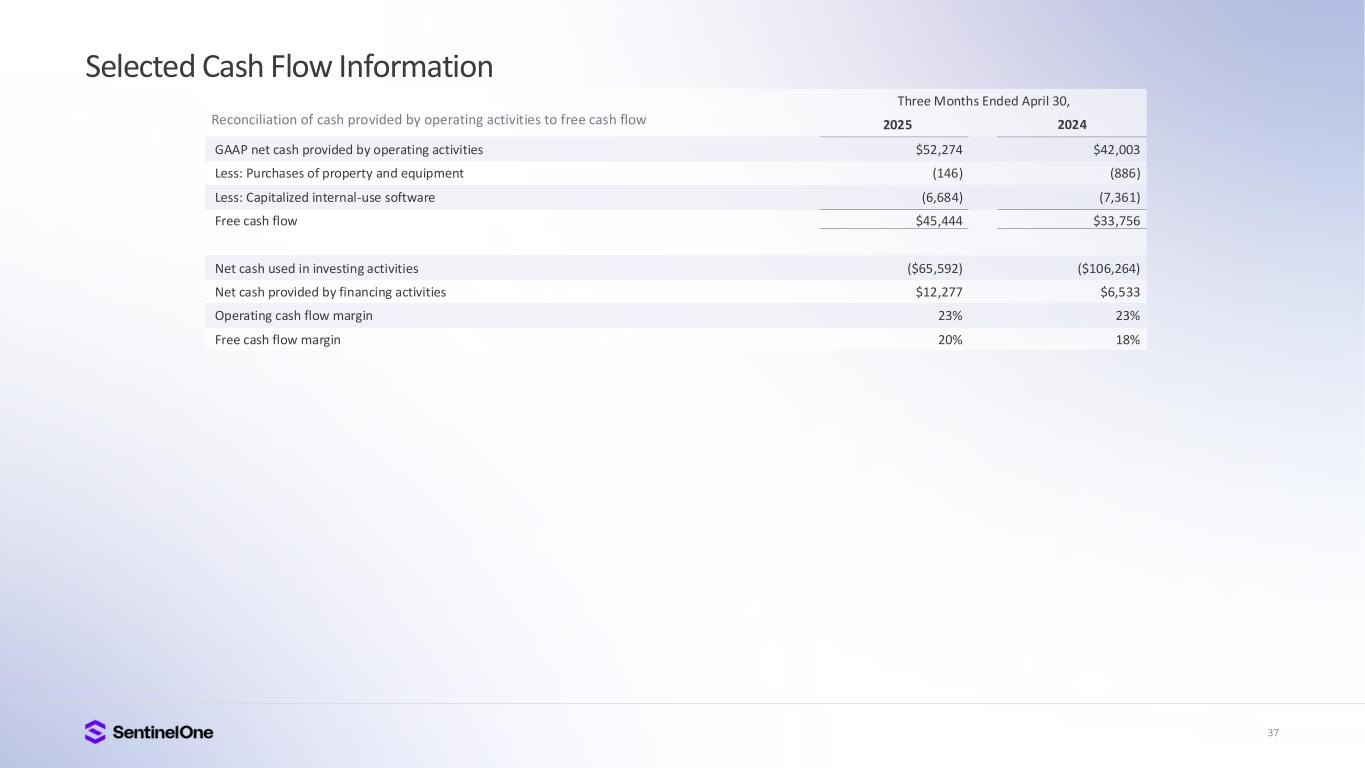 37 Selected Cash Flow Information GAAP net cash provided by operating activities Less: Purchases of property and equipment Less: Capitalized internal-use software Free cash flow Net cash used in investing activities Net cash provided by financing activities Operating cash flow margin Free cash flow margin $52,274 (146) (6,684) $45,444 ($65,592) $12,277 23% 20% $42,003 (886) (7,361) $33,756 ($106,264) $6,533 23% 18% Three Months Ended April 30, 2025 2024Reconciliation of cash provided by operating activities to free cash flow