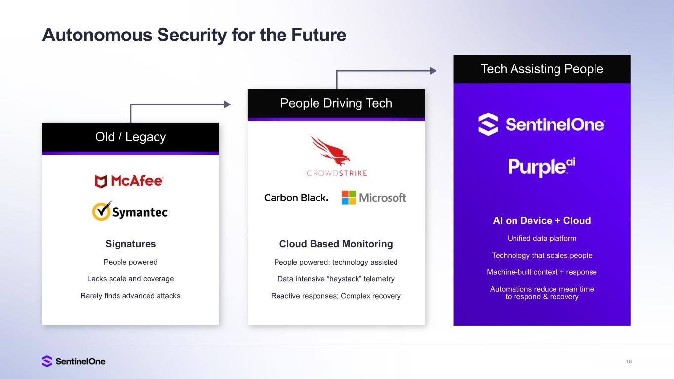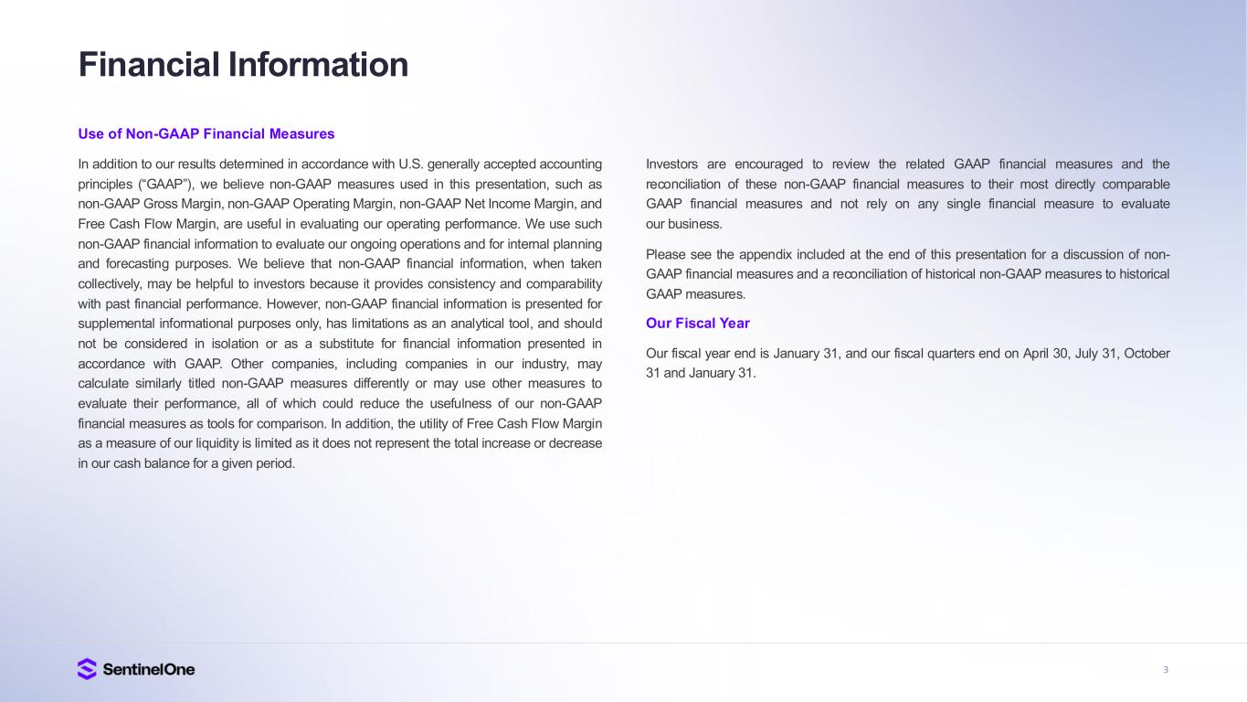 2 Safe Harbor This presentation includes express and implied “forward-looking statements”, including forward-looking statements within the meaning of the Private Securities Litigation Reform Act of 1995. Forward-looking statements include all statements that are not historical facts, and in some cases, can be identified by terms such as “anticipate,” “believe,” “can,” “continue,” “could,” “estimate,” “expect,” “intend,” “may,” “might,” “plan,” “potential,” “predict,” “project,” “should,” “will,” “would,” or the negative of these terms, and similar expressions that concern our expectations, strategy, plans or intentions. Forward-looking statements contained in this presentation include, but are not limited to, statements concerning our estimates of market size and opportunity, our strategic plans or objectives, our growth prospects, projections (including our long-term model), actual or perceived defects, errors or vulnerabilities in our platform; our ability to successfully integrate any acquisitions and strategic investments; risks associated with managing our rapid growth; general global political, economic, and macroeconomic climate, intense competition in the market we compete in, fluctuations in our operating results, our ability to attract new and retain existing customers, or renew and expand our relationships with them; the ability of our platform to effectively interoperate within our customers’ IT infrastructure; disruptions or other business interruptions that affect the availability of our platform including cybersecurity incidents; the failure to timely develop and achieve market acceptance of new products and subscriptions as well as existing products, subscriptions and support offerings; rapidly evolving technological developments in the market for security products and subscription and support offerings; length of sales cycles; and risks of securities class action litigation. By their nature, these statements are subject to numerous risks and uncertainties, including factors beyond our control, that could cause actual results, performance or achievement to differ materially and adversely from those anticipated or implied in the statements. Such risks and uncertainties are described in the “Risk Factors” of our most recent Form 10-K, most recent Form 10-Q, and subsequent filings with the Securities and Exchange Commission. Although our management believes that the expectations reflected in our statements are reasonable, we cannot guarantee that the future results, levels of activity, performance or events and circumstances described in the forward- looking statements will be achieved or occur. Recipients are cautioned not to place undue reliance on these forward-looking statements, which speak only as of the date such statements are made and should not be construed as statements of fact. Except to the extent required by federal securities laws, we undertake no obligation to update these forward- looking statements to reflect events or circumstances after the date hereof, or to reflect the occurrence of unanticipated events. Certain information contained in this presentation and statements made orally during this presentation relate to or are based on studies, publications, surveys and other data obtained from third-party sources and SentinelOne’s own internal estimates and research. While SentinelOne believes these third-party studies, publications, surveys and other data to be reliable as of the date of this presentation, it has not independently verified, and makes no representations as to the adequacy, fairness, accuracy or completeness of, any information obtained from third-party sources. In addition, no independent source has evaluated the reasonableness or accuracy of SentinelOne’s internal estimates or research and no reliance should be made on any information or statements made in this presentation relating to or based on such internal estimates and research.